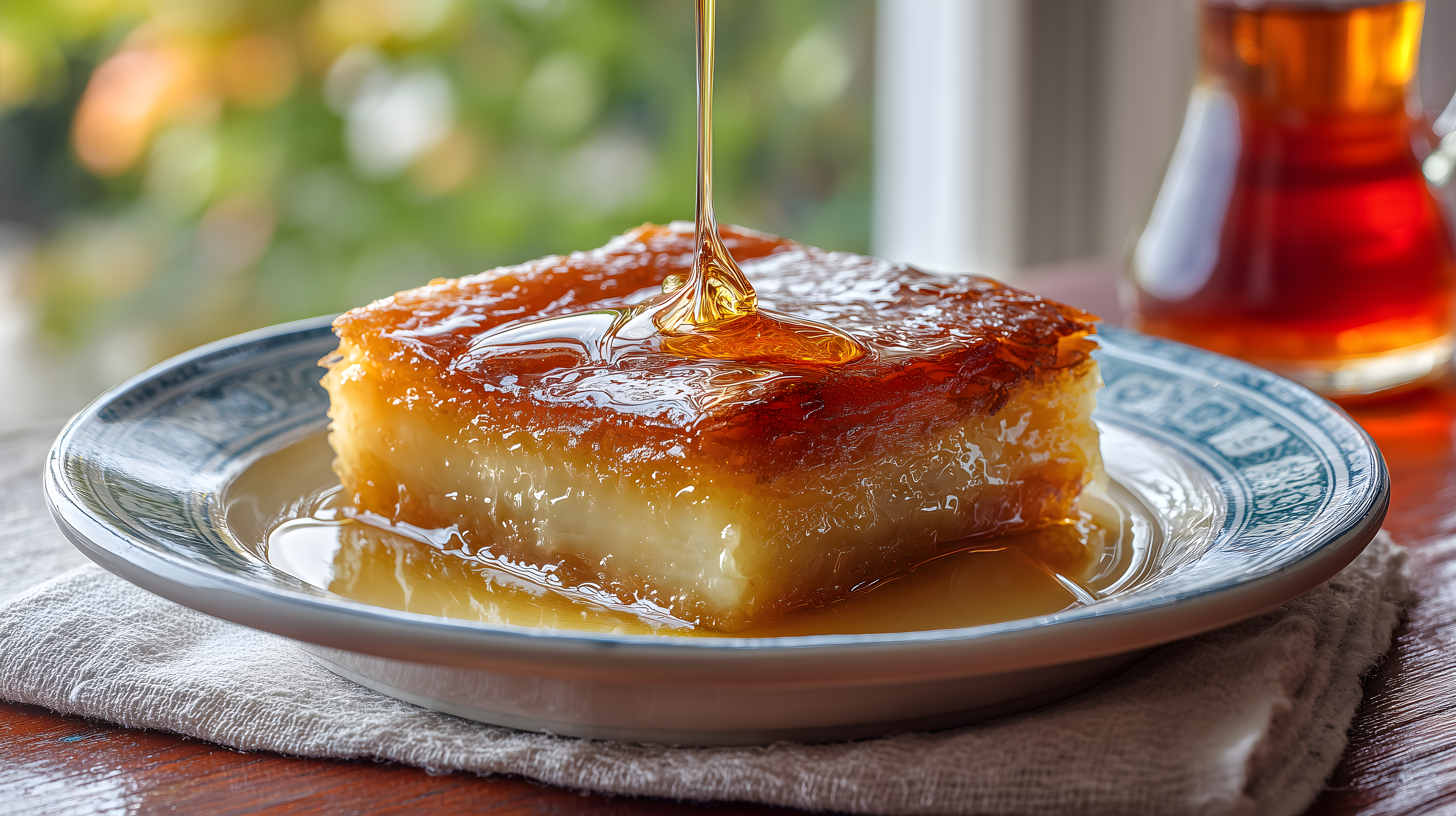 Galaktoboureko mit Sirup auf Teller und Serviette vor Fenster von Marco Verch unter Creative Commons 4.0