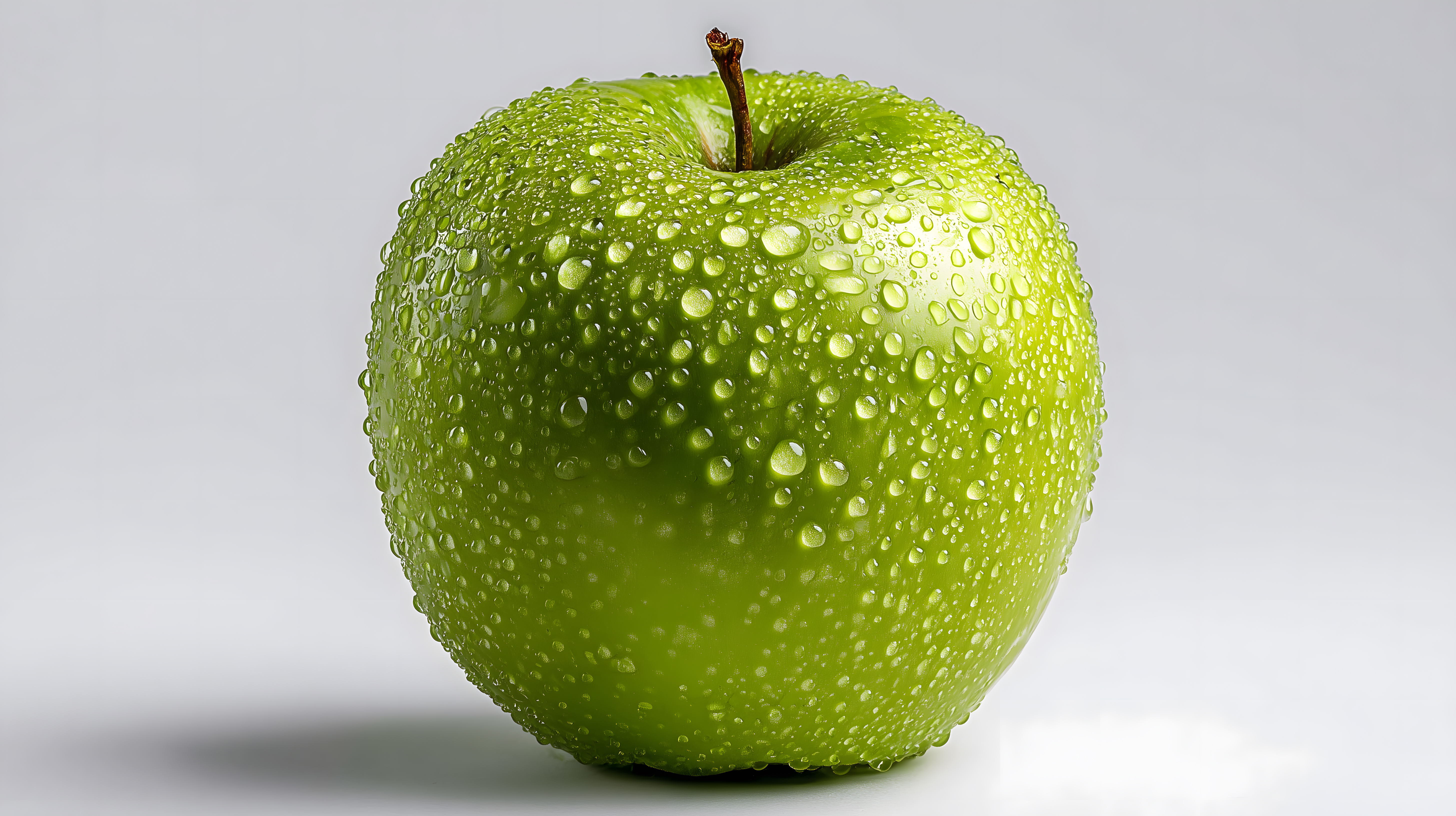Die Draufsicht-Perspektive und die scharfe Fokussierung auf den Apfel schaffen eine klare Komposition, die die Aufmerksamkeit des Betrachters auf das zentrale Objekt lenkt. Die kräftige Grünfärbung des Apfels, die von den Wassertropfen akzentuiert wird, verleiht dem Bild eine frische und lebendige Ausstrahlung.