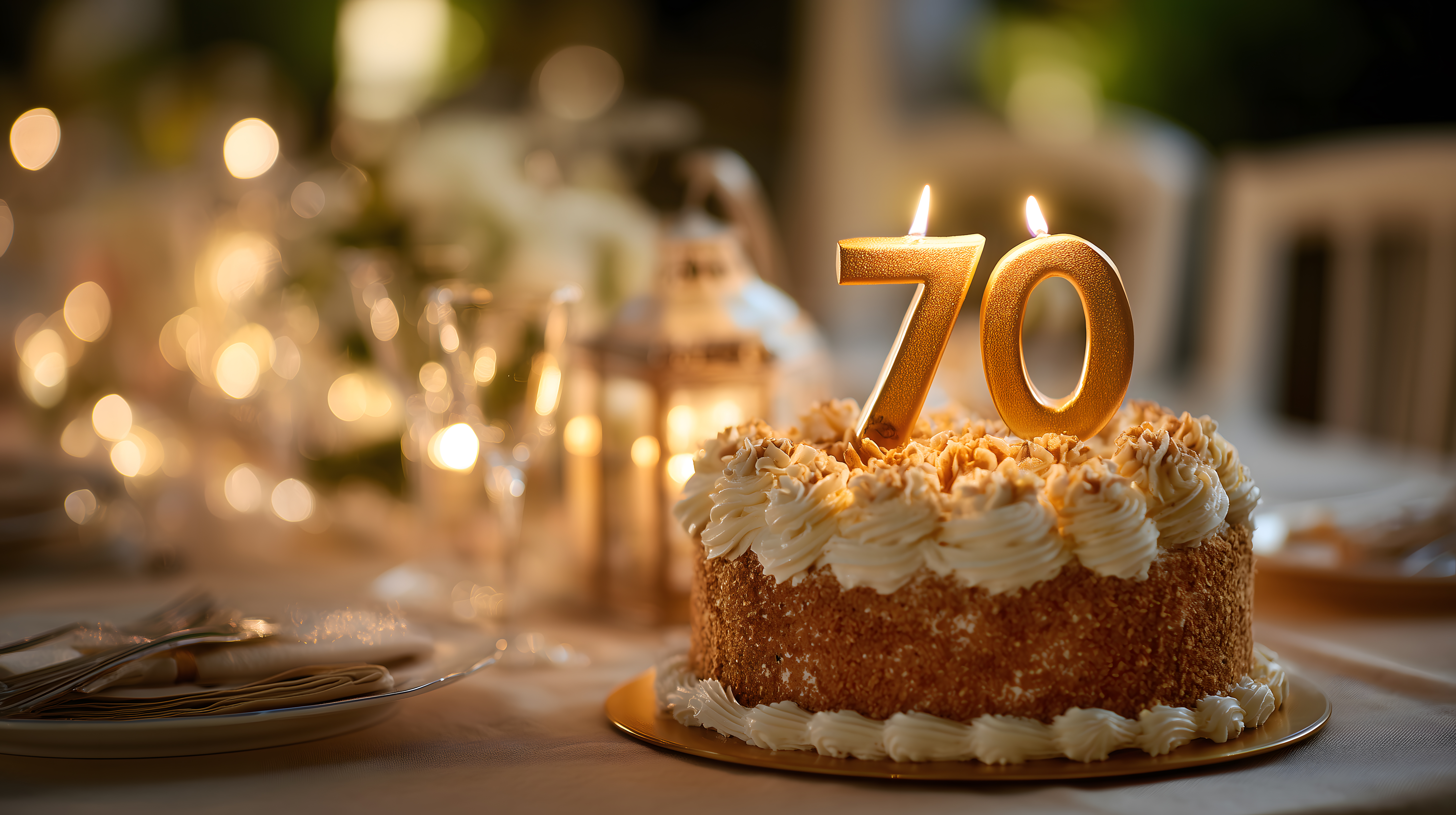 Das Bild zeigt einen feierlichen 70. Geburtstagskuchen, der auf einem Tisch platziert ist. Der Kuchen ist mit einer cremigen Oberfläche und goldenen Zahlen "70" verziert, die von brennenden Kerzen umgeben sind. Im Hintergrund sind verschwommene Lichter zu sehen, die eine festliche Atmosphäre schaffen.