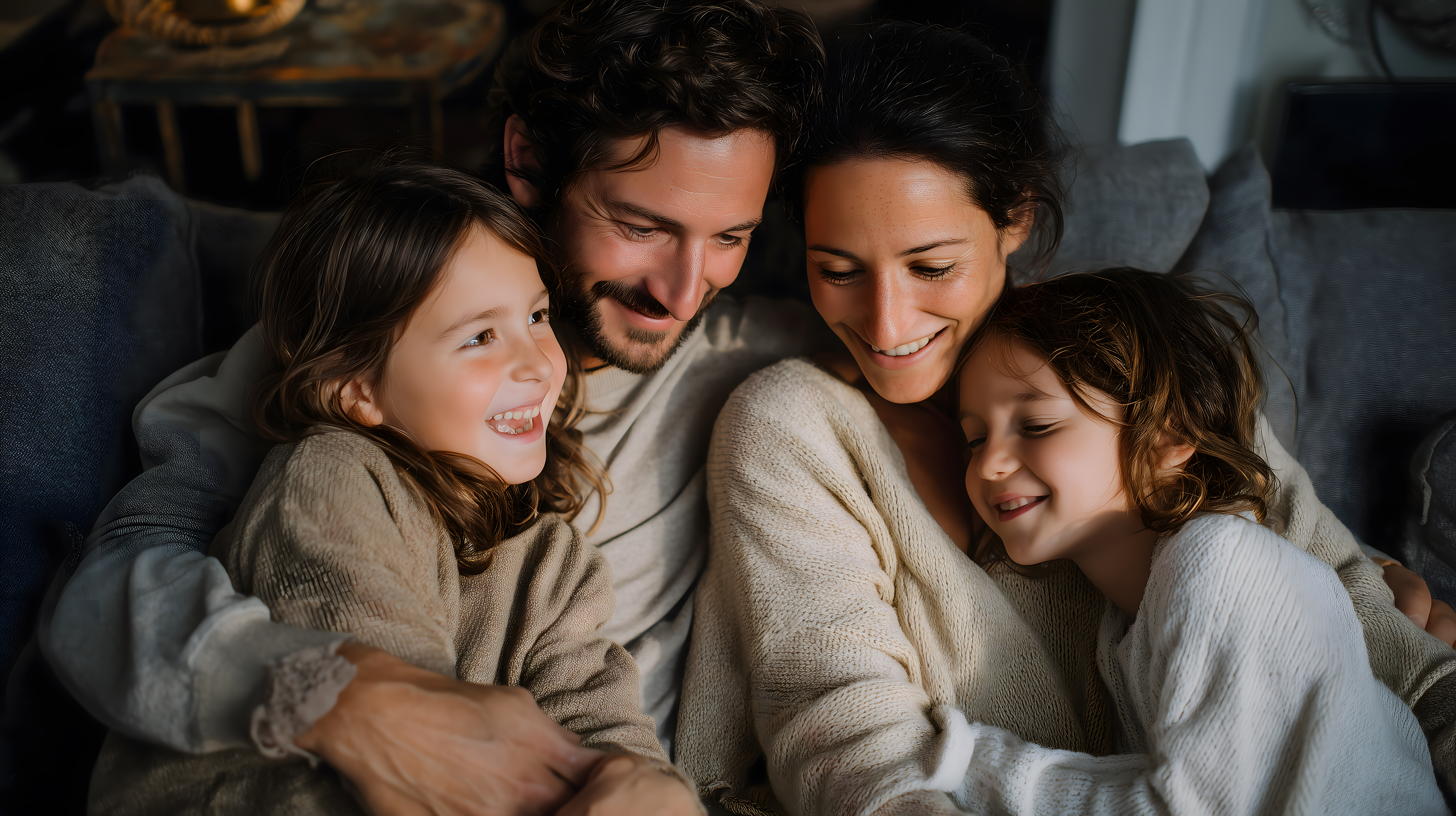 Das Bild zeigt eine liebevolle, familiäre Szene mit einem Vater, einer Mutter und zwei kleinen Mädchen, die eng umschlungen auf einer Couch sitzen. Die Aufnahme ist in einem dunklen, warmen Ambiente gehalten, was eine gemütliche Atmosphäre schafft. Die Verwendung von Erdtönen in den Kleidungsstücken und der Raumgestaltung verleiht dem Bild eine natürliche Ausstrahlung. Die Komposition ist ausgewogen, mit den Gesichtern der Familie als Blickfang.