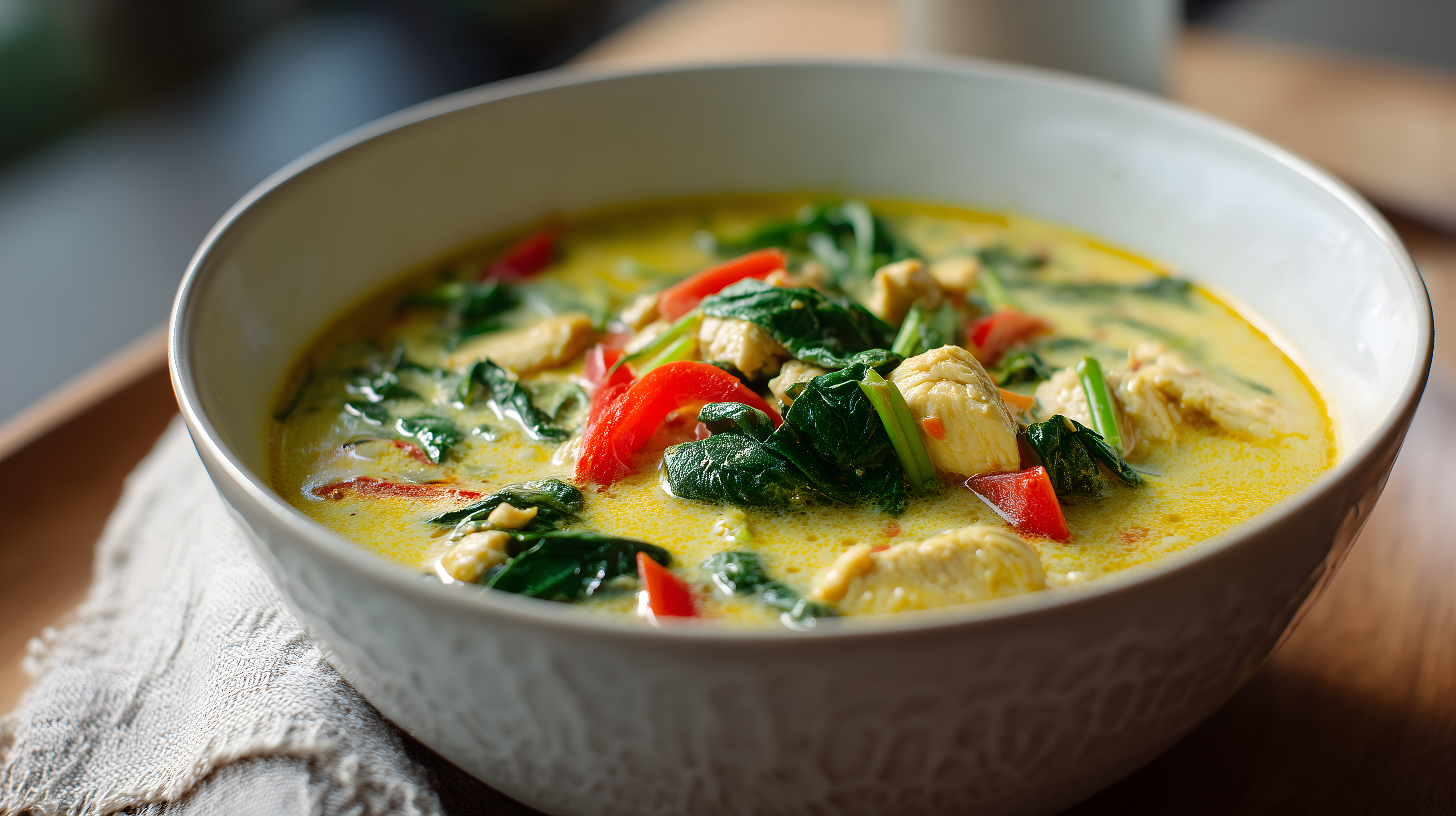Das Foto zeigt eine dampfende Schüssel mit einem leckeren, farbenfrohen Gemüseeintopf. Die Perspektive ist eine Draufsicht, wodurch der Betrachter einen direkten Blick auf das köstliche Gericht erhält. Die Farbpalette dominiert in Gelb- und Grüntönen, was eine appetitliche und gesunde Ausstrahlung vermittelt. Die Komposition ist ausgewogen, mit sorgfältig arrangierten Zutaten wie roten Paprikastücken und frischem Spinat, die den Eintopf optisch ansprechend machen.