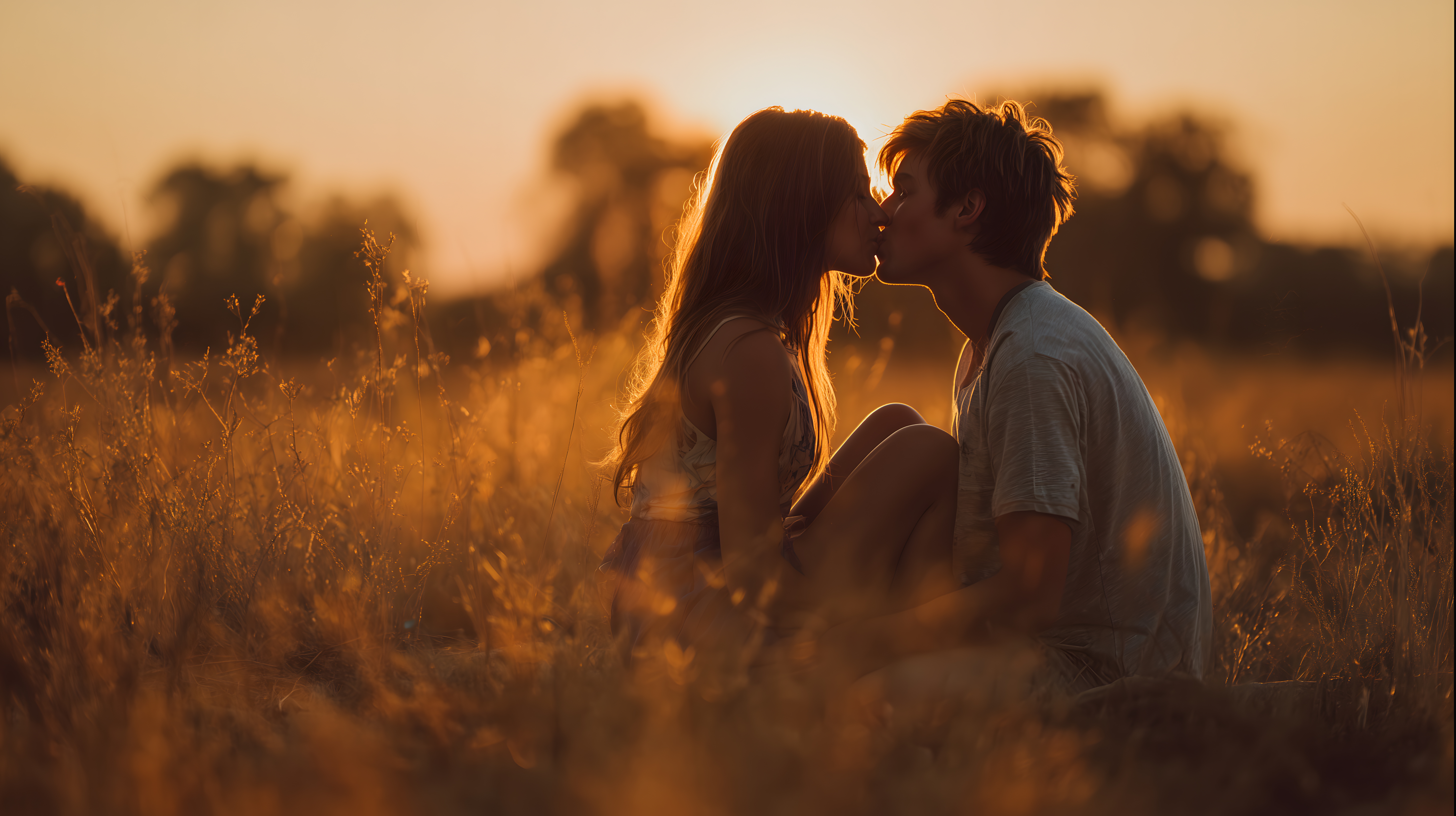 Das Bild zeigt ein verliebtes Paar, das sich in einem goldenen Feld bei Sonnenuntergang küsst. Die Perspektive ist leicht aus der Sicht von oben gewählt, wodurch die romantische Atmosphäre betont wird. Die warme Farbpalette in Orangetönen verleiht der Szene eine stimmungsvolle, fast märchenhafte Ausstrahlung.