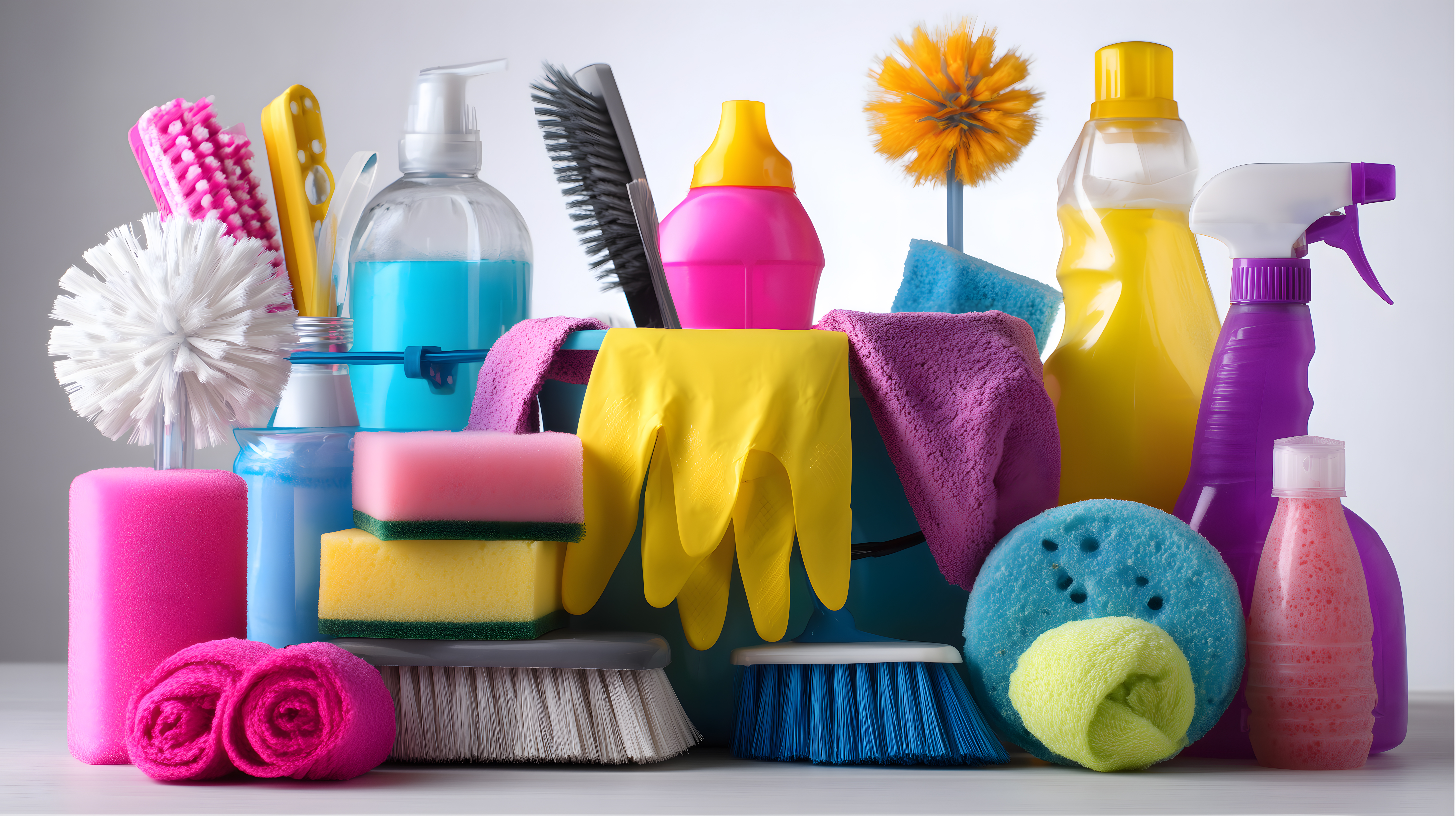 Das Bild zeigt eine Vielzahl an Reinigungsutensilien und Haushaltsartikeln, die in einer übersichtlichen Anordnung auf einem grauen Hintergrund präsentiert werden. Die Farbpalette ist bunt und leuchtend, mit dominanten Farbtönen wie Rosa, Gelb und Blau, die eine lebendige und freundliche Atmosphäre schaffen.