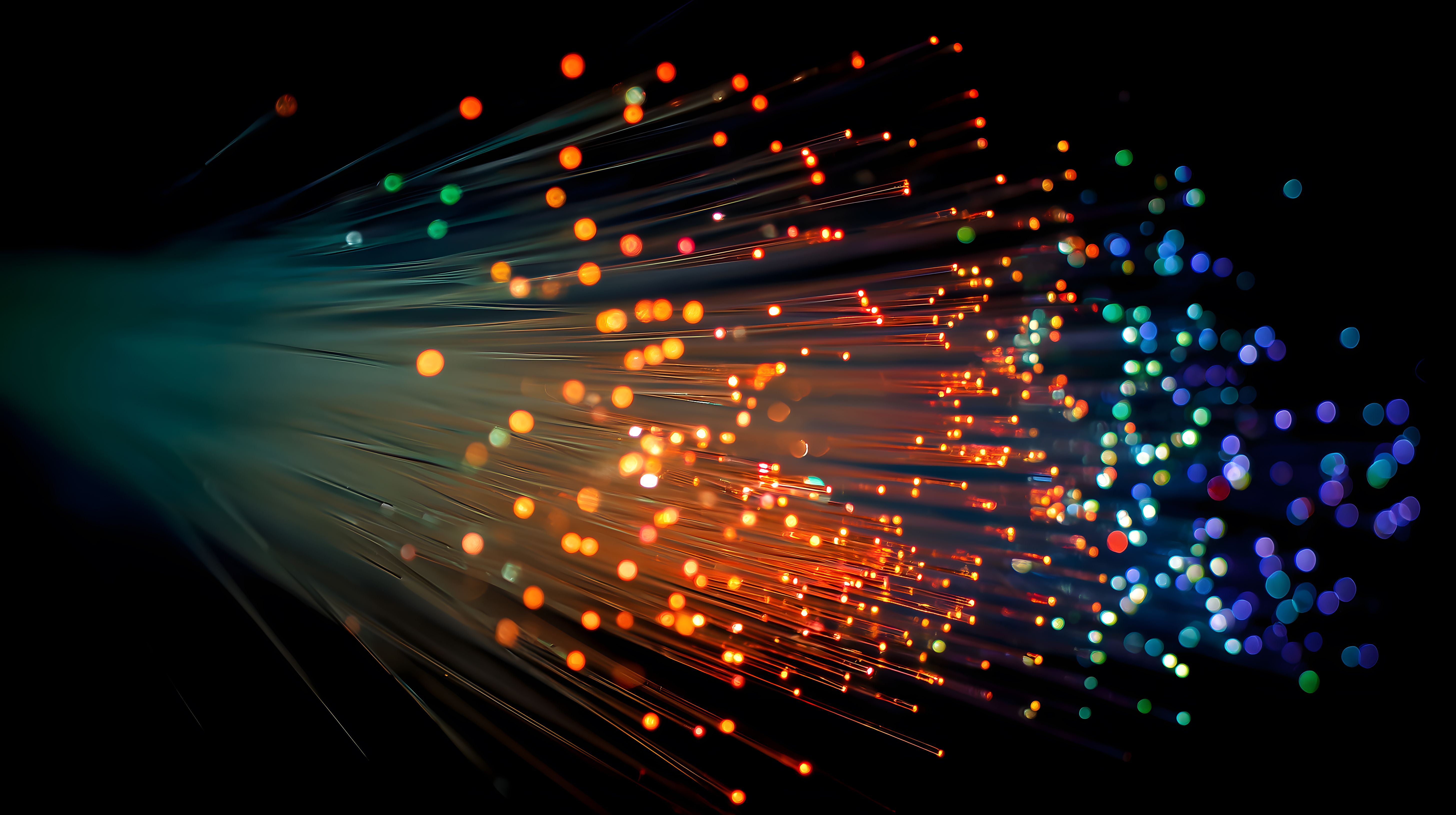 Das Bild zeigt ein Feuerwerk aus bunten, leuchtenden Lichtpunkten, die in einer dynamischen Bewegung über den dunklen Hintergrund fliegen. Die Perspektive ist leicht schräg, wodurch der Eindruck von Tiefe und Geschwindigkeit entsteht. Die Farbpalette reicht von warmen Orangetönen bis hin zu kühlen Blautönen, was eine farbintensive und stimmungsvolle Atmosphäre schafft.