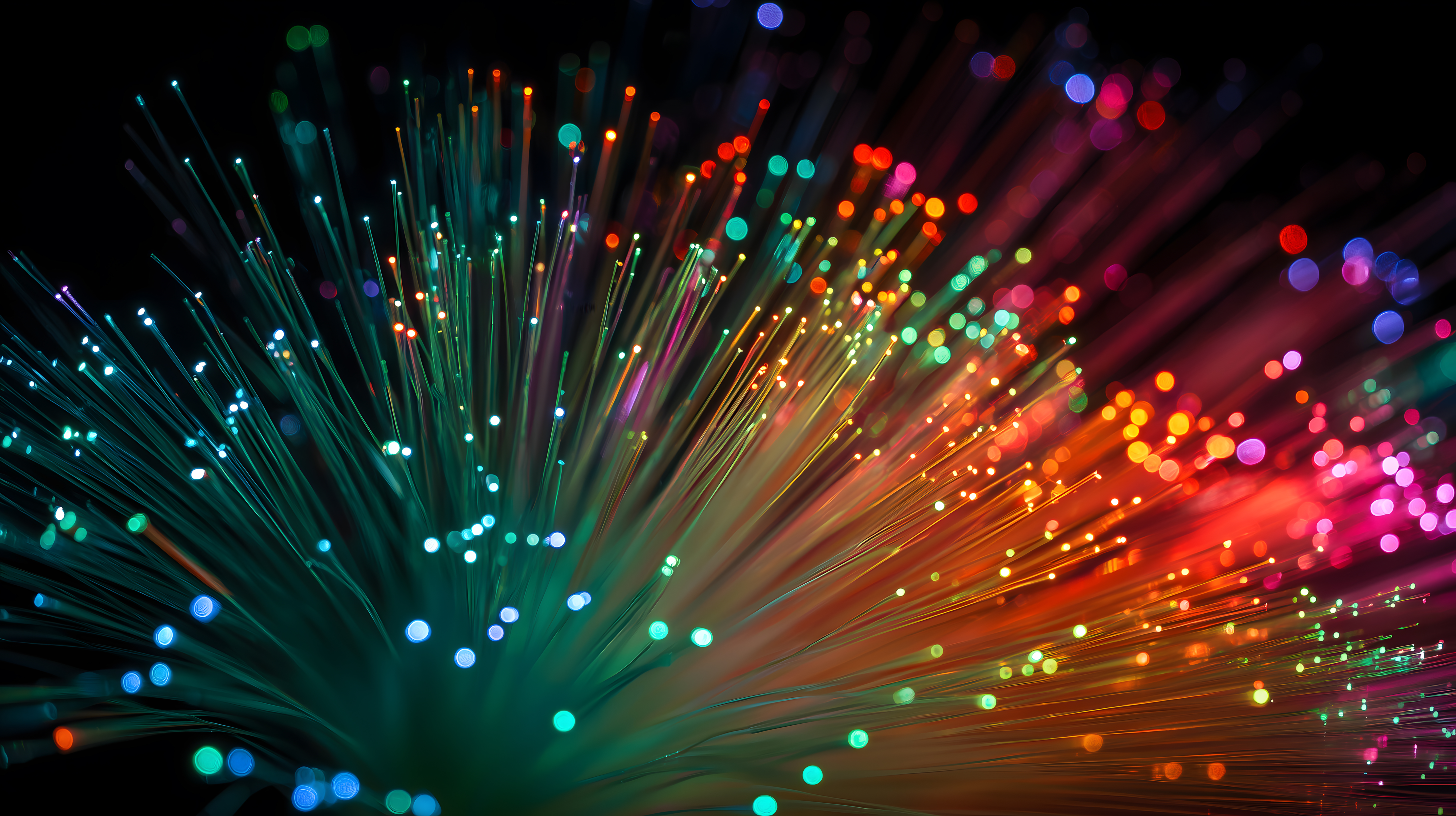 Das Bild zeigt eine explosive Ansammlung bunter Lichtpunkte, die an Fasern von Glasfaserkabeln erinnern. Die Farben reichen von tiefem Blau über Grün und Orange bis hin zu leuchtendem Rot. Die Perspektive ist eine Nahaufnahme, die den Betrachter in das Farbspektrum eintauchen lässt. Die Komposition ist symmetrisch und zentriert, was dem Bild eine dynamische und fesselnde Wirkung verleiht.