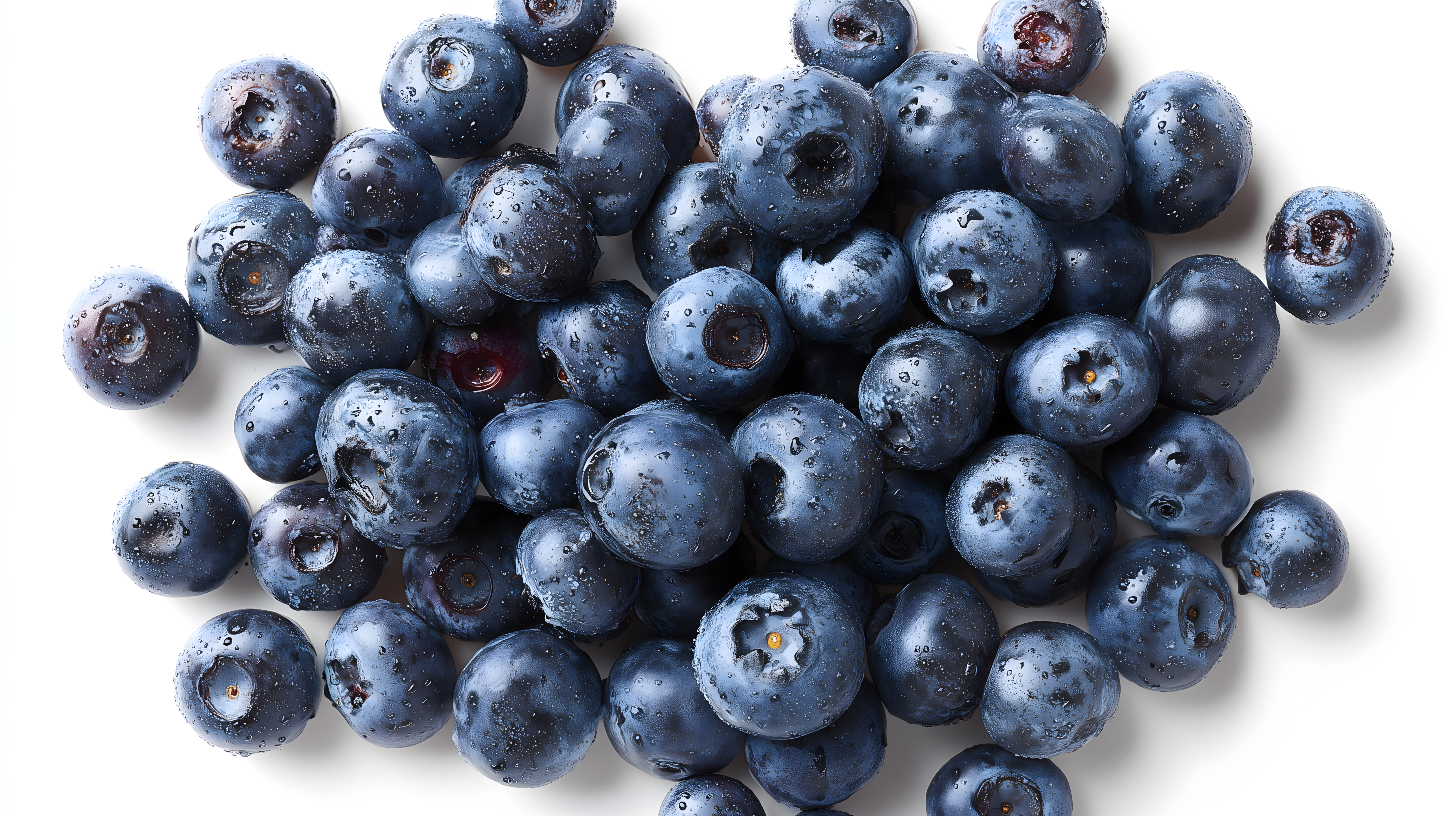 Das Bild zeigt eine Vielzahl von saftigen, reifenblaubeeren mit Wassertropfen auf weißem Hintergrund. Die Perspektive ist eine Draufsicht, die die Blaubeeren in einer detaillierten, nahaufnahmenartigen Darstellung präsentiert. Die dunkelblaue Farbpalette der Früchte kontrastiert scharf mit dem hellen Hintergrund, was eine klar strukturierte und ästhetisch ansprechende Komposition ergibt.