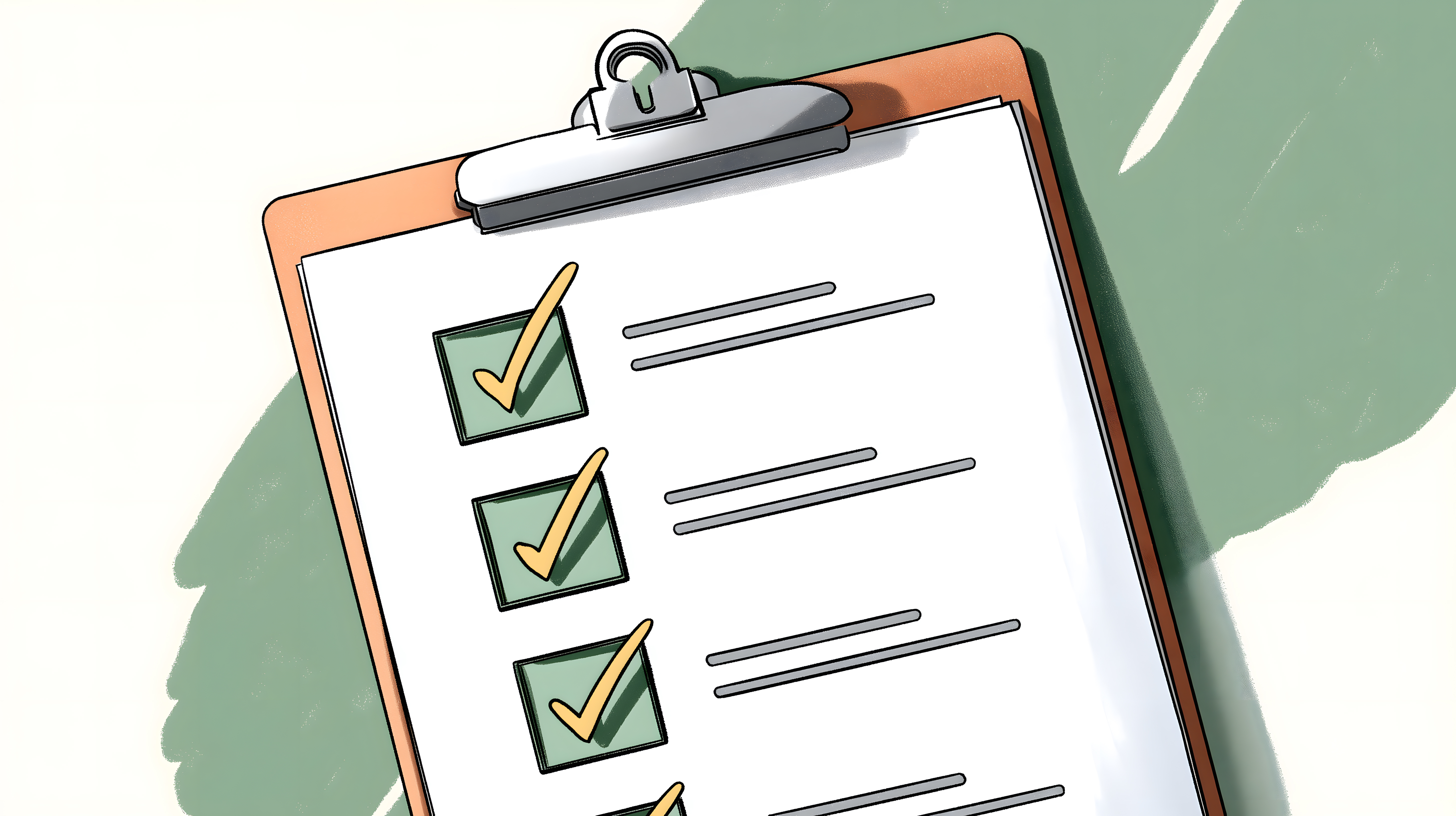 Das Bild zeigt eine Draufsicht auf eine Zwischenablage mit einem Checklisten-Symbol und einem Schreibblock. Die Farbpalette ist minimalistisch, mit dominanten Grüntönen und Schwarz-Weiß-Elementen, was dem Bild eine moderne und professionelle Anmutung verleiht. Die Komposition ist klar und übersichtlich, was die Fokussierung auf die Checkliste erleichtert.