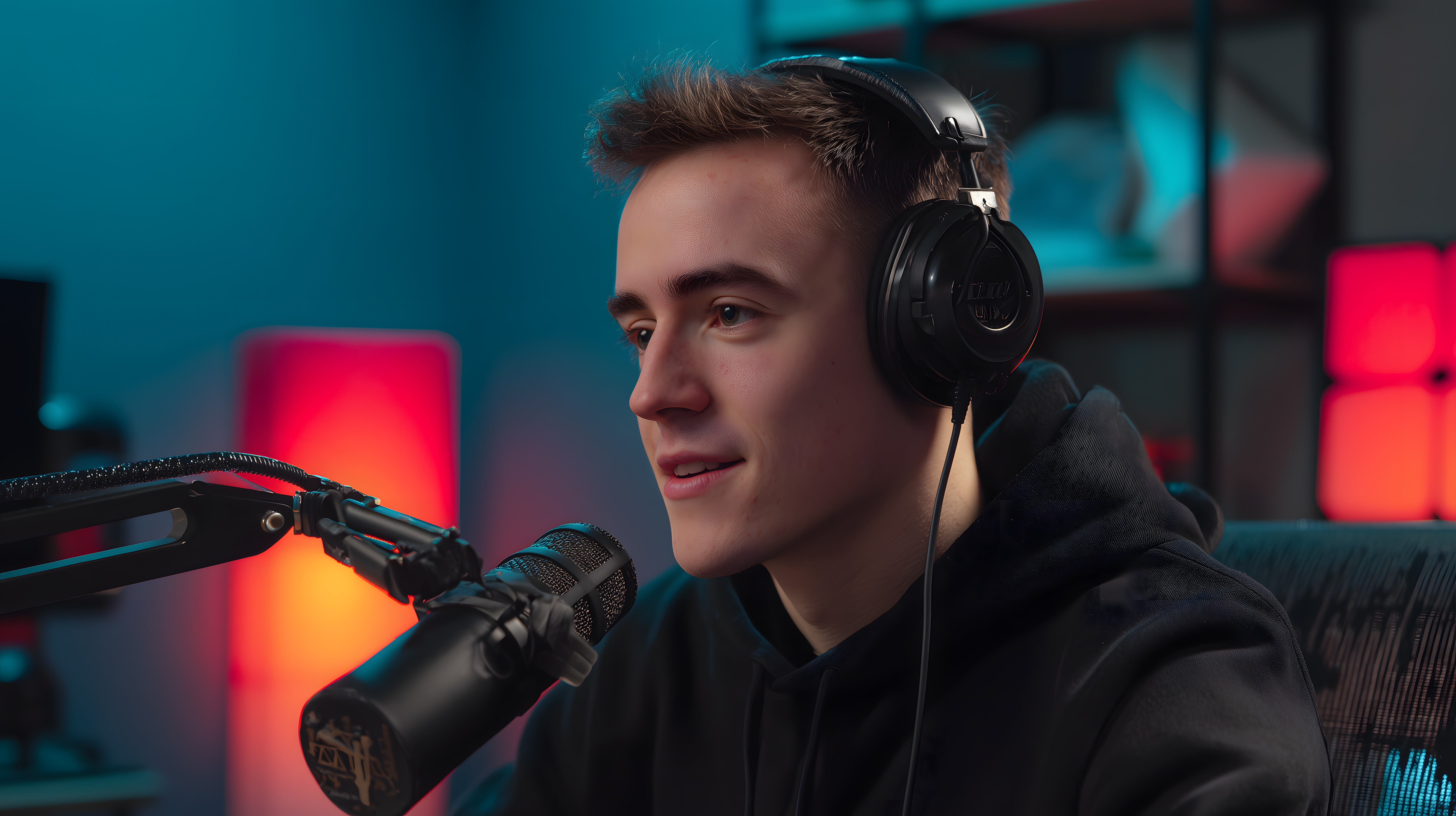 Das Bild zeigt einen Mann, der vor einem Mikrofon sitzt und Kopfhörer trägt. Die Kamera nimmt eine Nahaufnahme aus einem leicht erhöhten Winkel auf, was dem Bild eine dynamische Perspektive verleiht. Die Farbpalette besteht hauptsächlich aus kühlen Blautönen und warmen Rottönen, was eine stimmungsvolle und hochwertige Atmosphäre schafft.