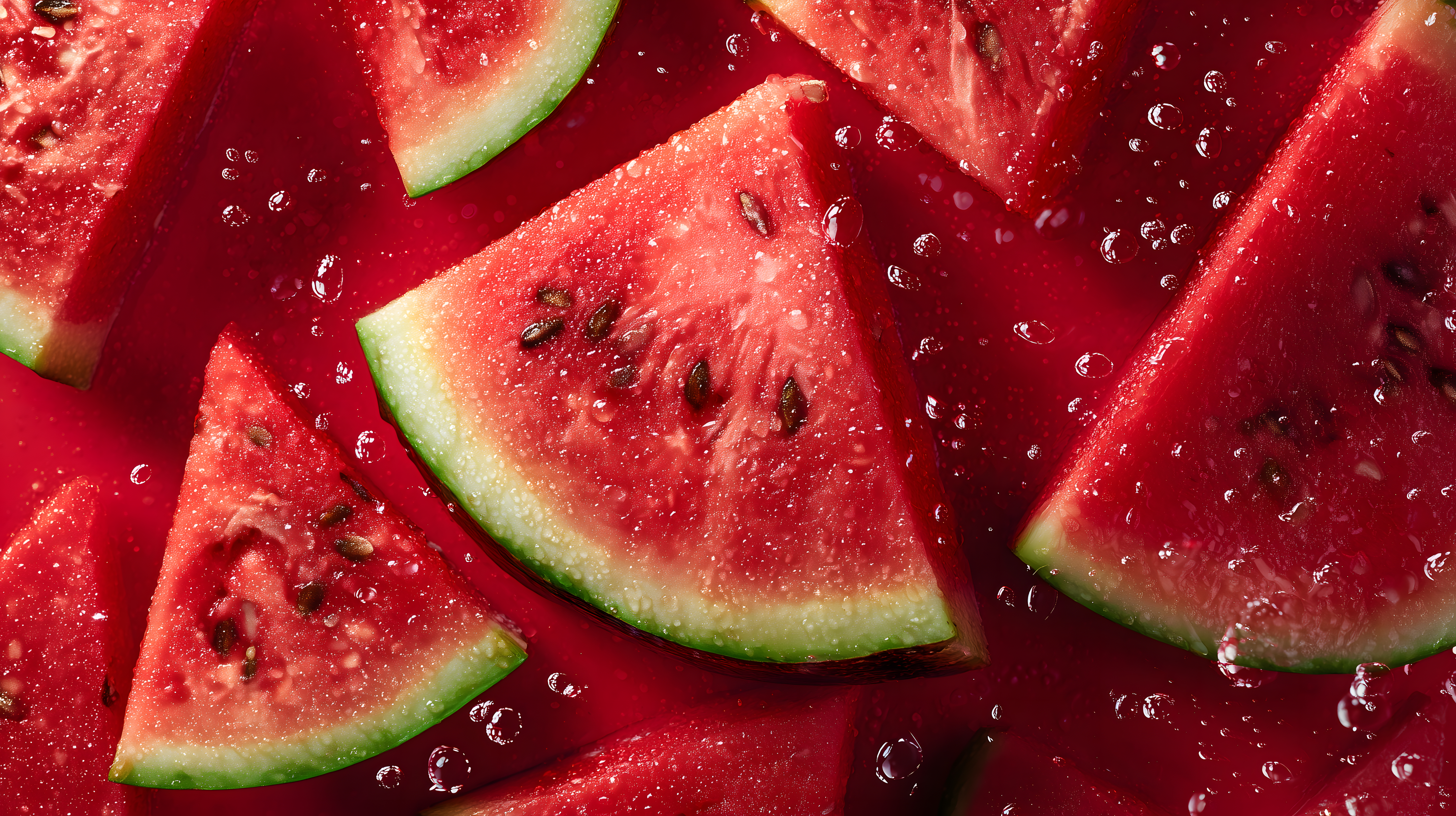 Das Foto zeigt eine Nahaufnahme von saftigen, roten Wassermelonenscheiben mit grünen Schalen auf einer nassen, glänzenden Oberfläche. Die Früchte sind in einem warmen, sättigenden Farbspektrum gehalten, das von tiefem Rot bis hin zu satten Grüntönen reicht. Die Tropfen auf der Oberfläche verleihen der Szene eine erfrischende, sommerliche Atmosphäre.