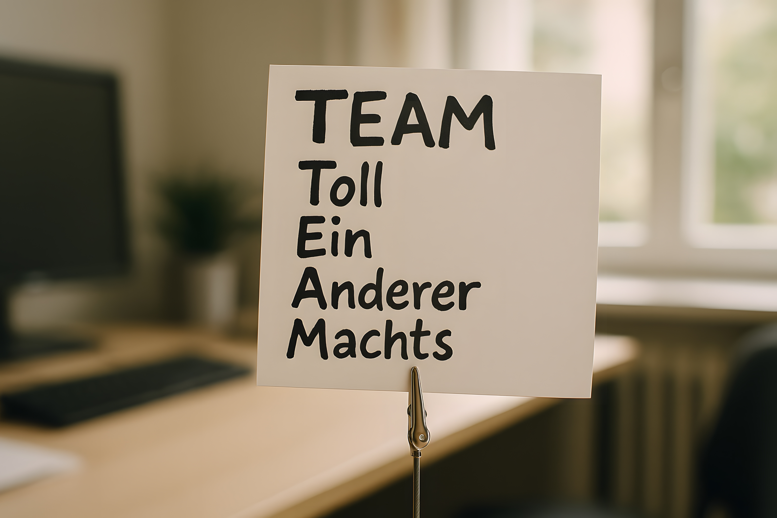Das Foto zeigt ein Pappschild mit der Aufschrift "TEAM Toll Ein Anderer Machts" in schwarzer Schrift auf weißem Hintergrund. Das Schild steht auf einer Oberfläche, die leicht unscharf im Hintergrund zu sehen ist.