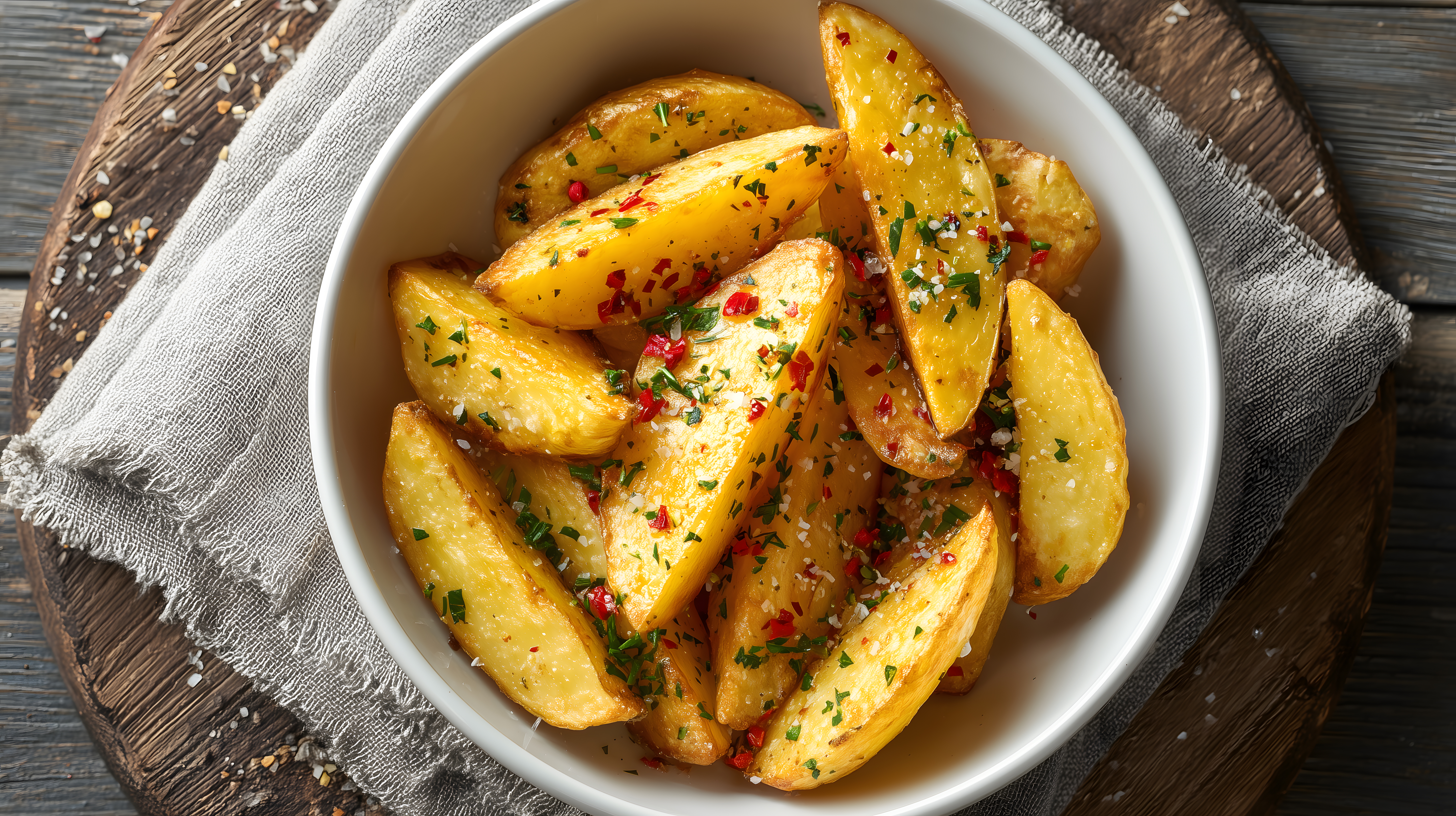 Das Bild zeigt eine Nahaufnahme einer weißen Schüssel mit knusprig gebratenen Kartoffelecken. Die Kartoffeln sind goldgelb und mit würzigen Gewürzen wie Paprika, Kräutern und Salz bestreut. Die Schüssel steht auf einem dunklen, holzigen Untergrund, der einen rustikalen und gemütlichen Eindruck vermittelt.