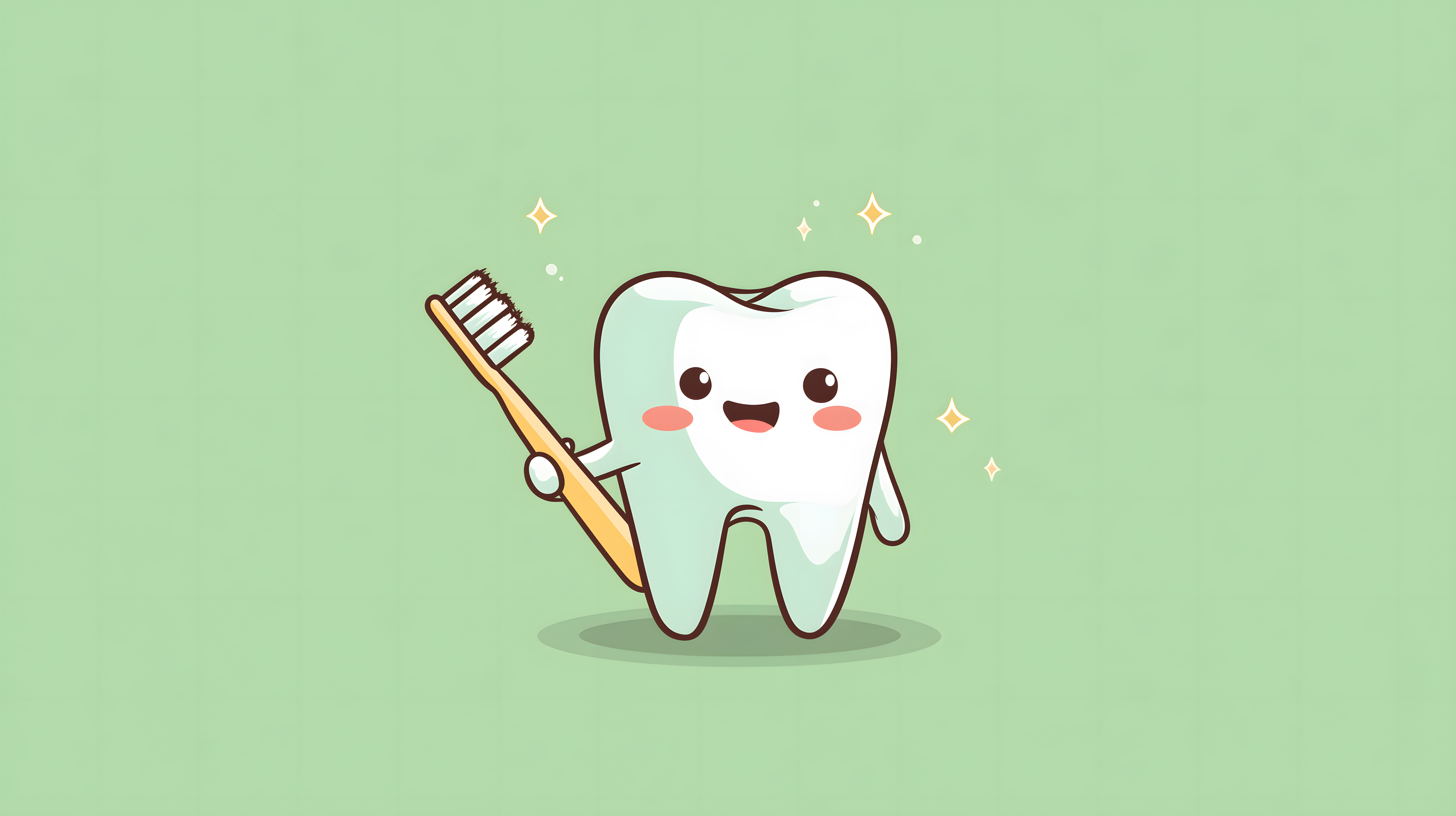Dieses niedliche Cartoon-Bild zeigt einen strahlenden Zahn, der eine Zahnbürste in der Hand hält. Der Zahn hat große, weiße Augen und einen fröhlichen Ausdruck. Das Bild wird von einer sanften grünen Farbe umrahmt, die eine freundliche und frische Atmosphäre vermittelt.