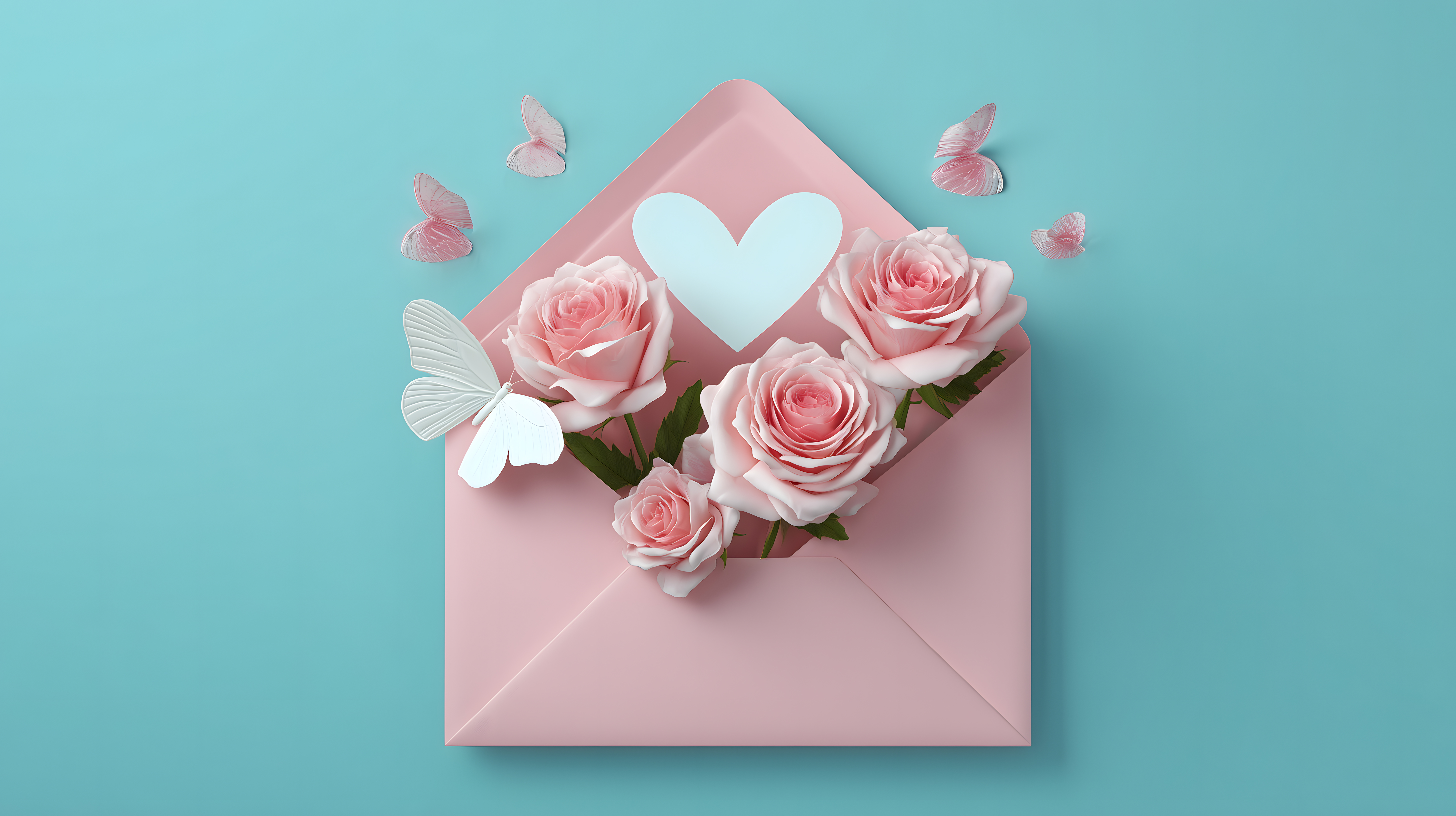 Das Bild zeigt eine rosa Umschlagkarte, die mit einem weißen Herzen und zarten rosafarbenen Rosen geschmückt ist. Kleine weiße Schmetterlinge schweben um die Komposition, die vor einem hellblauen Hintergrund platziert ist. Die Nahaufnahme der Szene verleiht ihr eine romantische und einladende Atmosphäre.