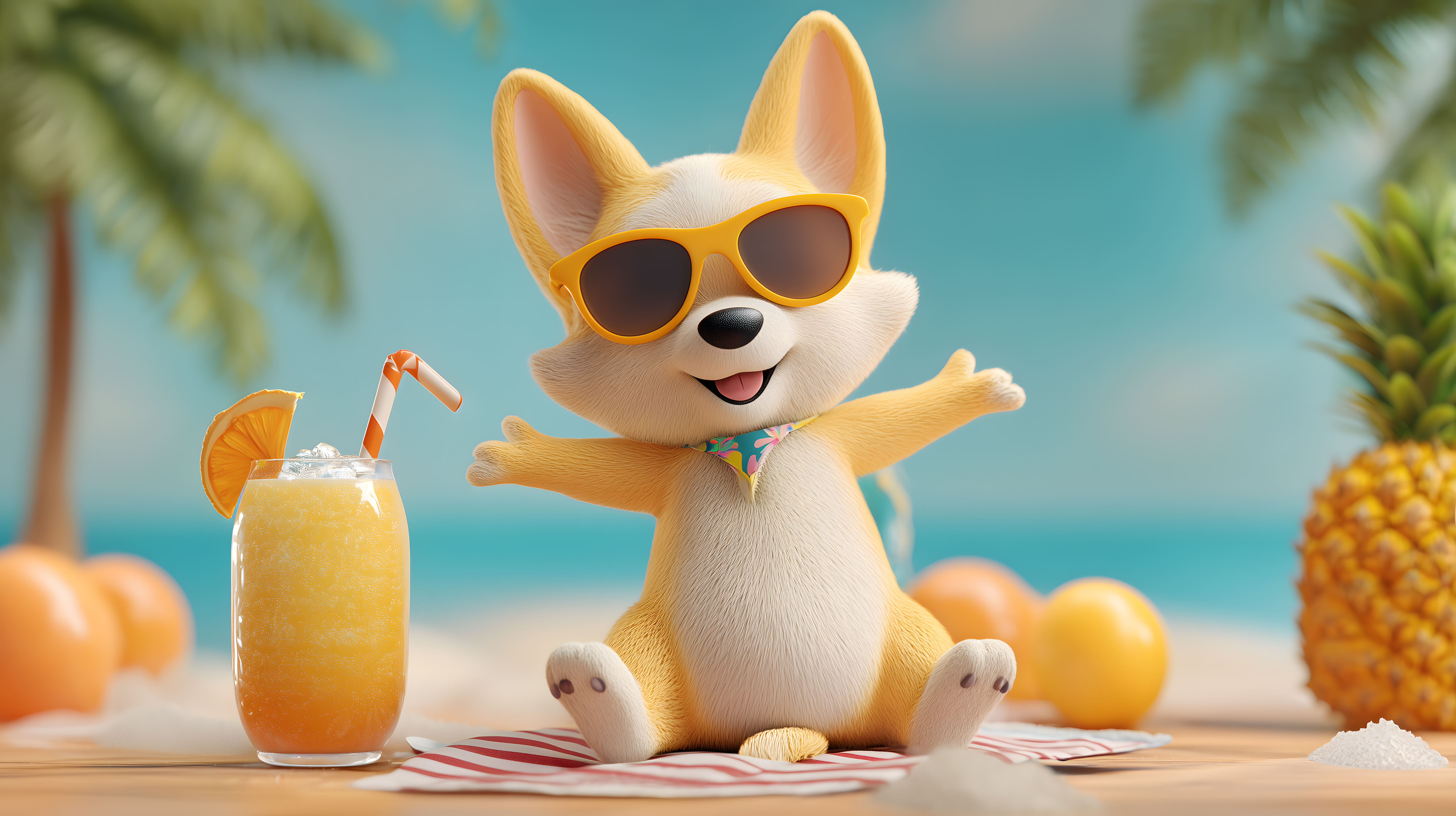 Das Bild zeigt einen niedlichen, gelben Corgi-Hund, der in einer tropischen Umgebung sitzend eine Sonnenbrille und einen Cocktail mit Orangenschnitz hält. Der Hund hat einen fröhlichen und entspannten Ausdruck und vermittelt eine sommerliche, urlaubsartige Stimmung.