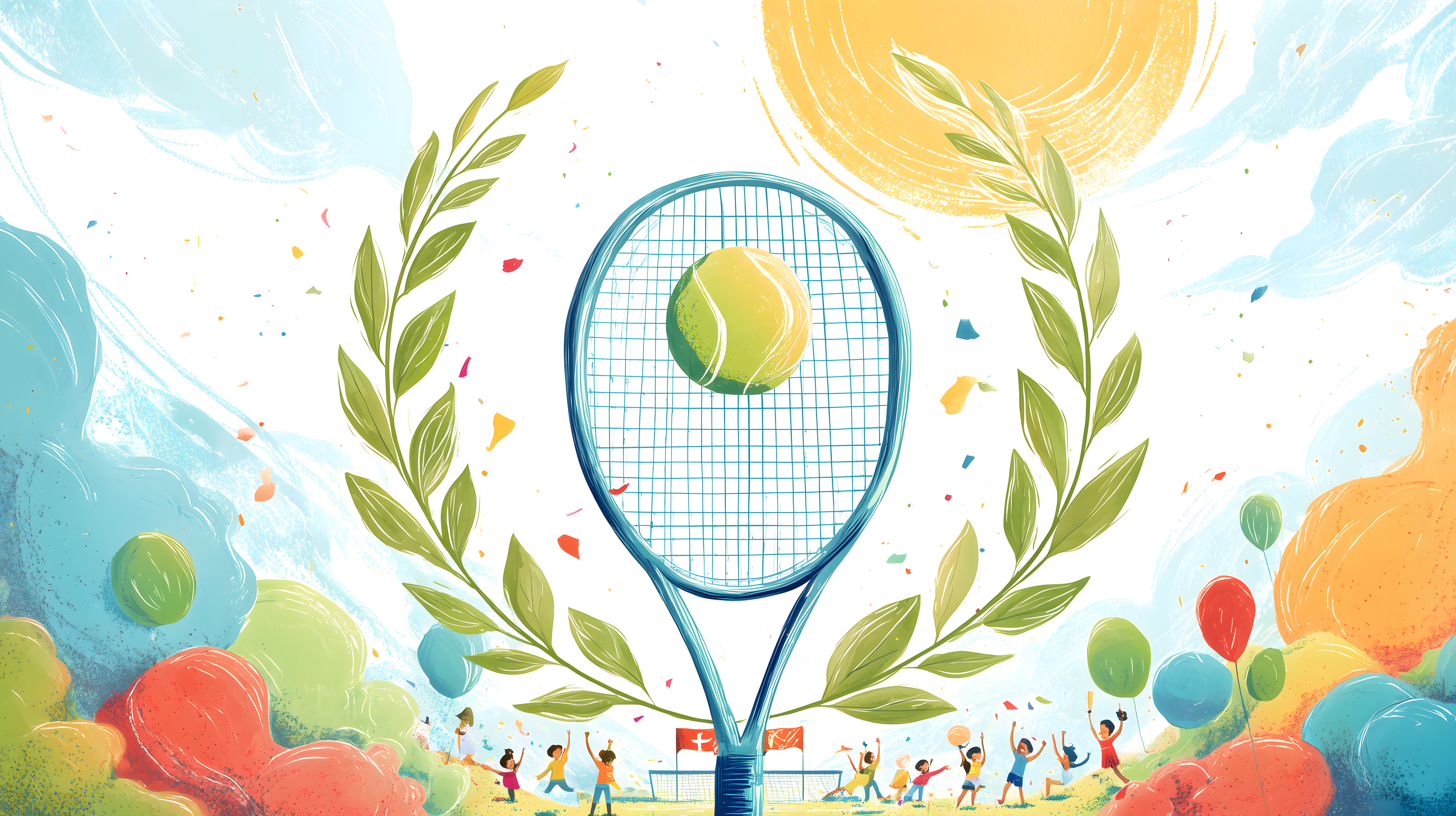 Das Bild zeigt eine bunte und fröhliche Szene rund um einen Tennisschläger und einen Tennisball. Im Vordergrund ist ein blauer Tennisschläger mit einem leuchtenden Tennisball zu sehen, umrahmt von üppiger, grüner Vegetation. Im Hintergrund spielen und springen fröhliche Menschen, die die Freude am Tennissport zum Ausdruck bringen.