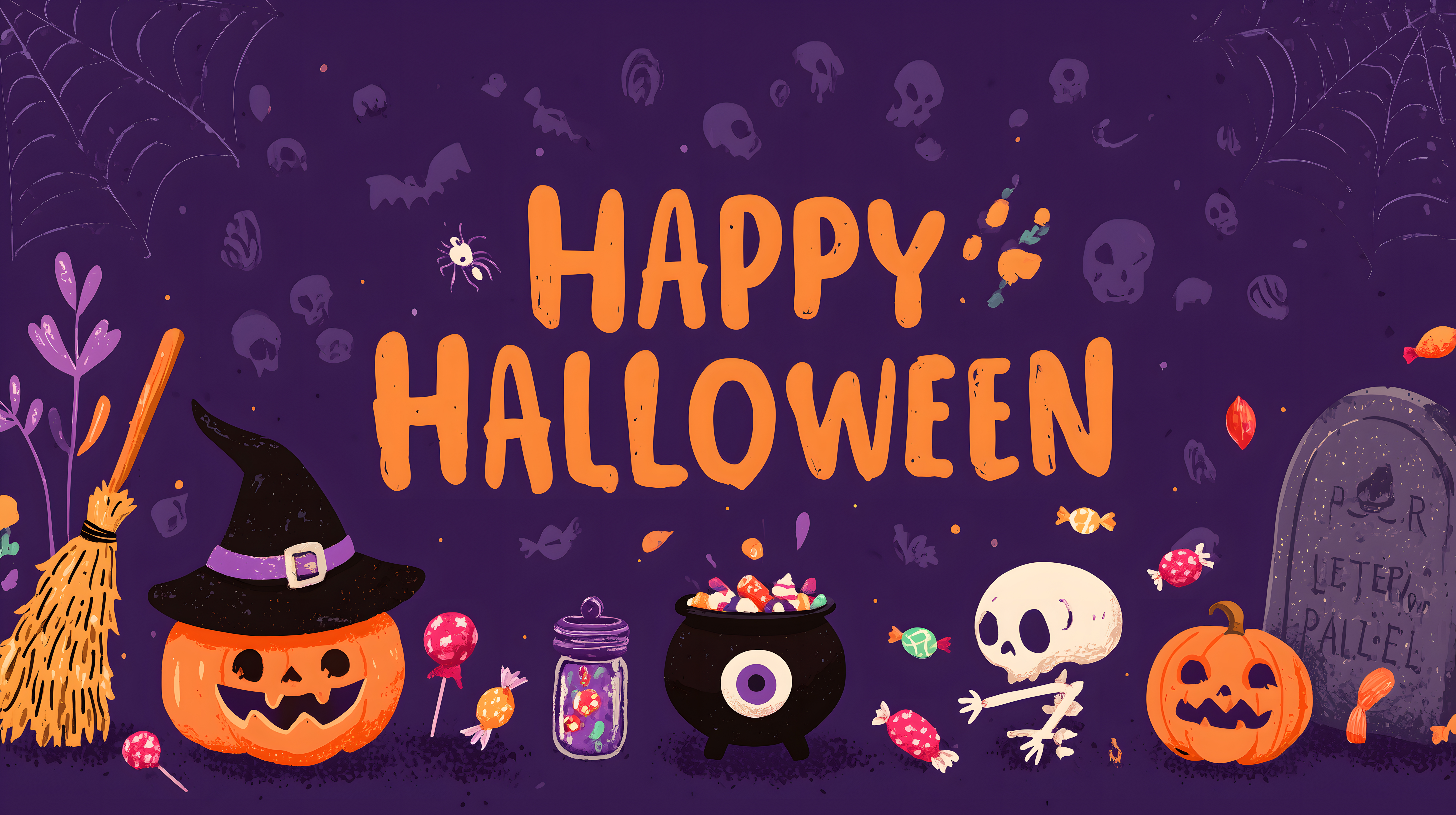 Das Bild zeigt eine bunte, detaillierte Halloween-Szene vor einem dunklen, mystischen Hintergrund. Im Vordergrund sind verschiedene Halloween-Symbole wie ein Kürbis, ein Hexenhut, ein Kessel voller Süßigkeiten und ein Skelett zu sehen. Die Farbpalette ist hauptsächlich in Lila, Orange und Schwarz gehalten, was eine düstere, aber gleichzeitig fröhliche Stimmung erzeugt.