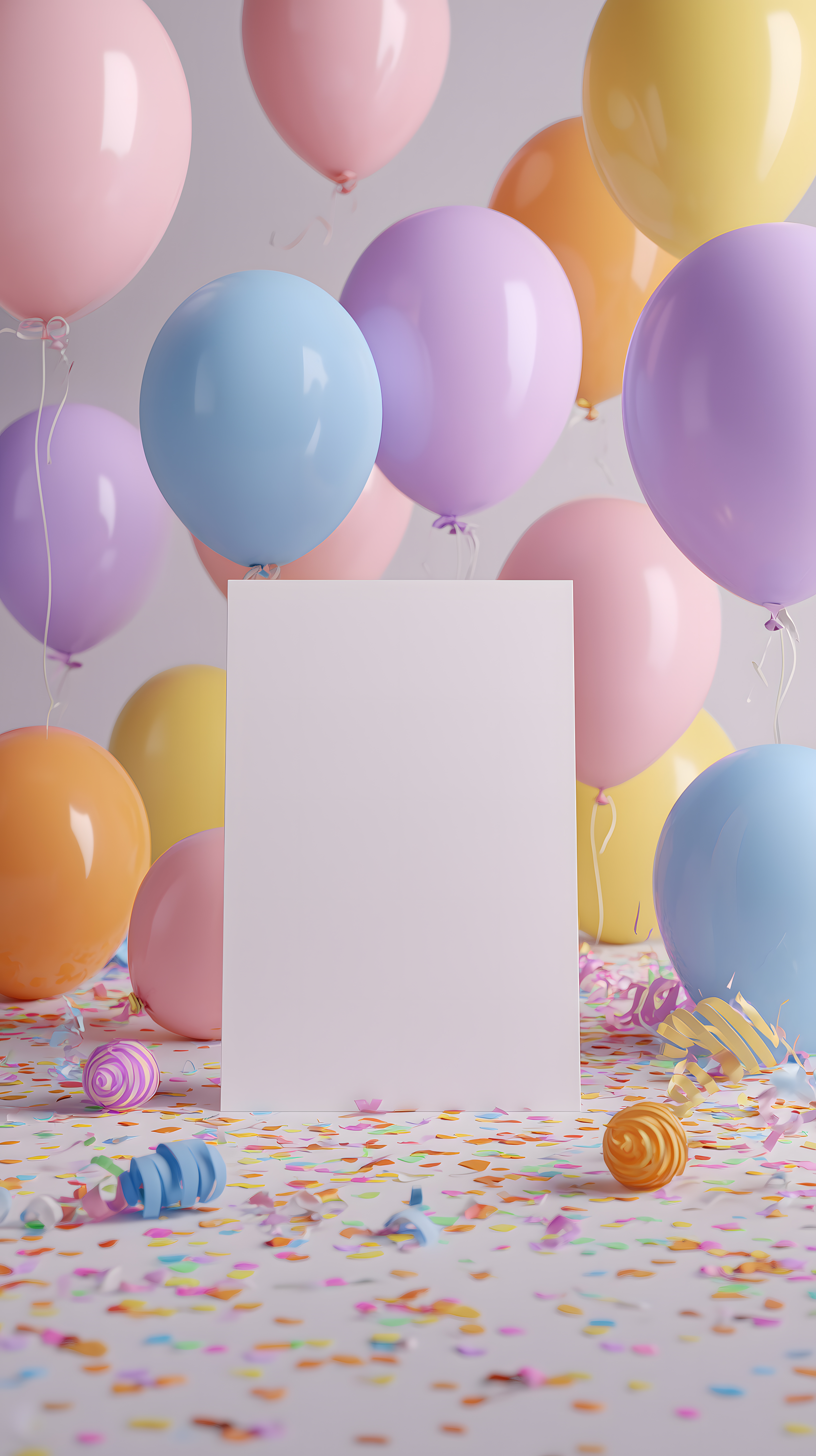 Das Foto zeigt eine Vielzahl von bunten Ballons in verschiedenen Pastelltönen, die vor einem weißen Hintergrund schweben. In der Mitte des Bildes befindet sich ein leerer weißer Rahmen, der als Platz für Text oder Grafiken dienen könnte. Rund um den Rahmen liegen bunte Konfetti und gewundene Papierstreifen, die eine festliche Atmosphäre schaffen.