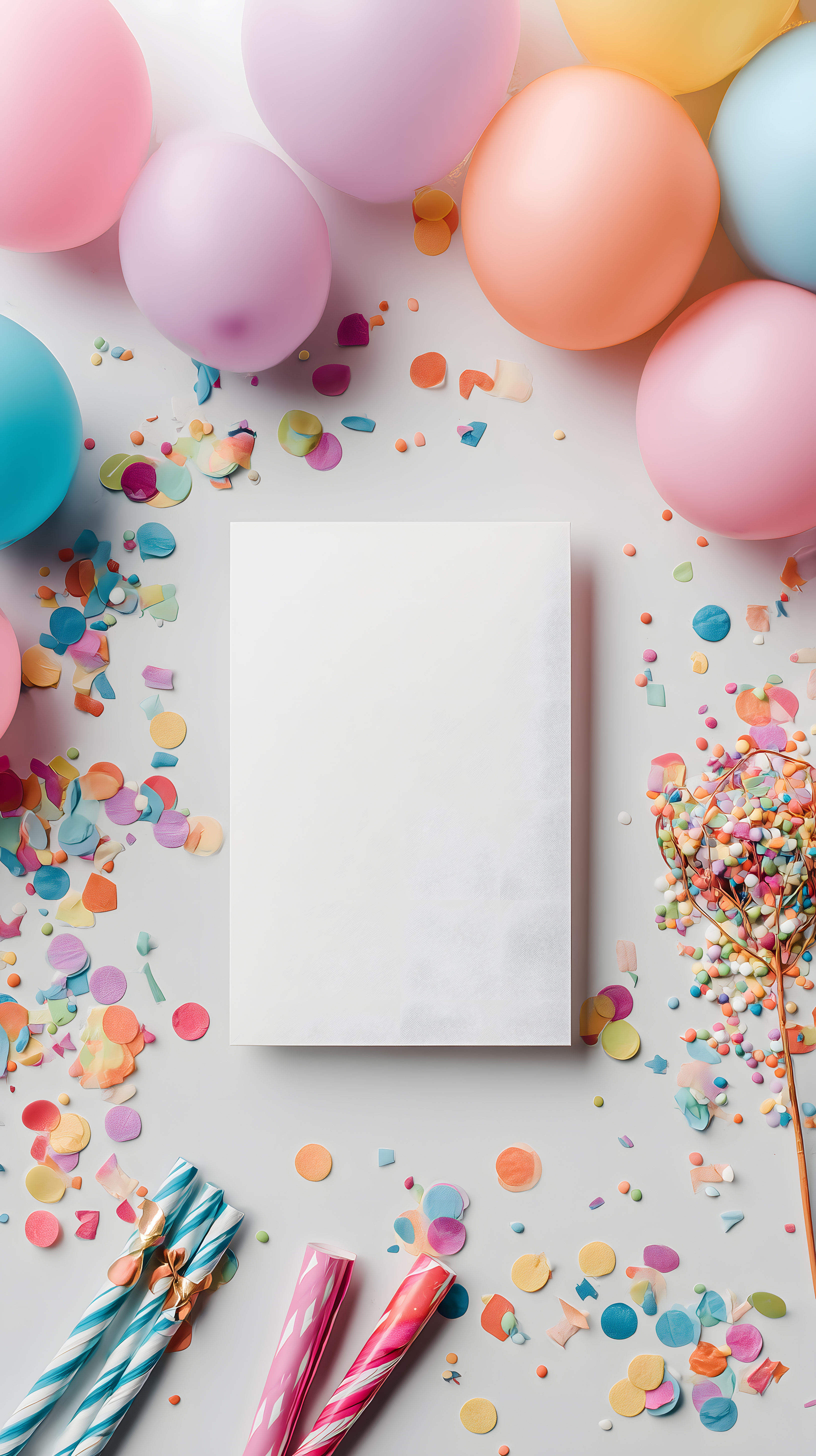 Das Bild zeigt eine bunte Anordnung verschiedener Partydekoration, bestehend aus bunten Ballons, Konfetti und einem weißen Textfeldrahmen. Die Perspektive ist eine Draufsicht auf eine flache Oberfläche, die mit den farbenfrohen Elementen dekoriert ist. Die Farbpalette umfasst ein breites Spektrum an Pastelltönen wie Rosa, Blau, Orange und Gelb, die eine fröhliche und festliche Stimmung vermitteln.