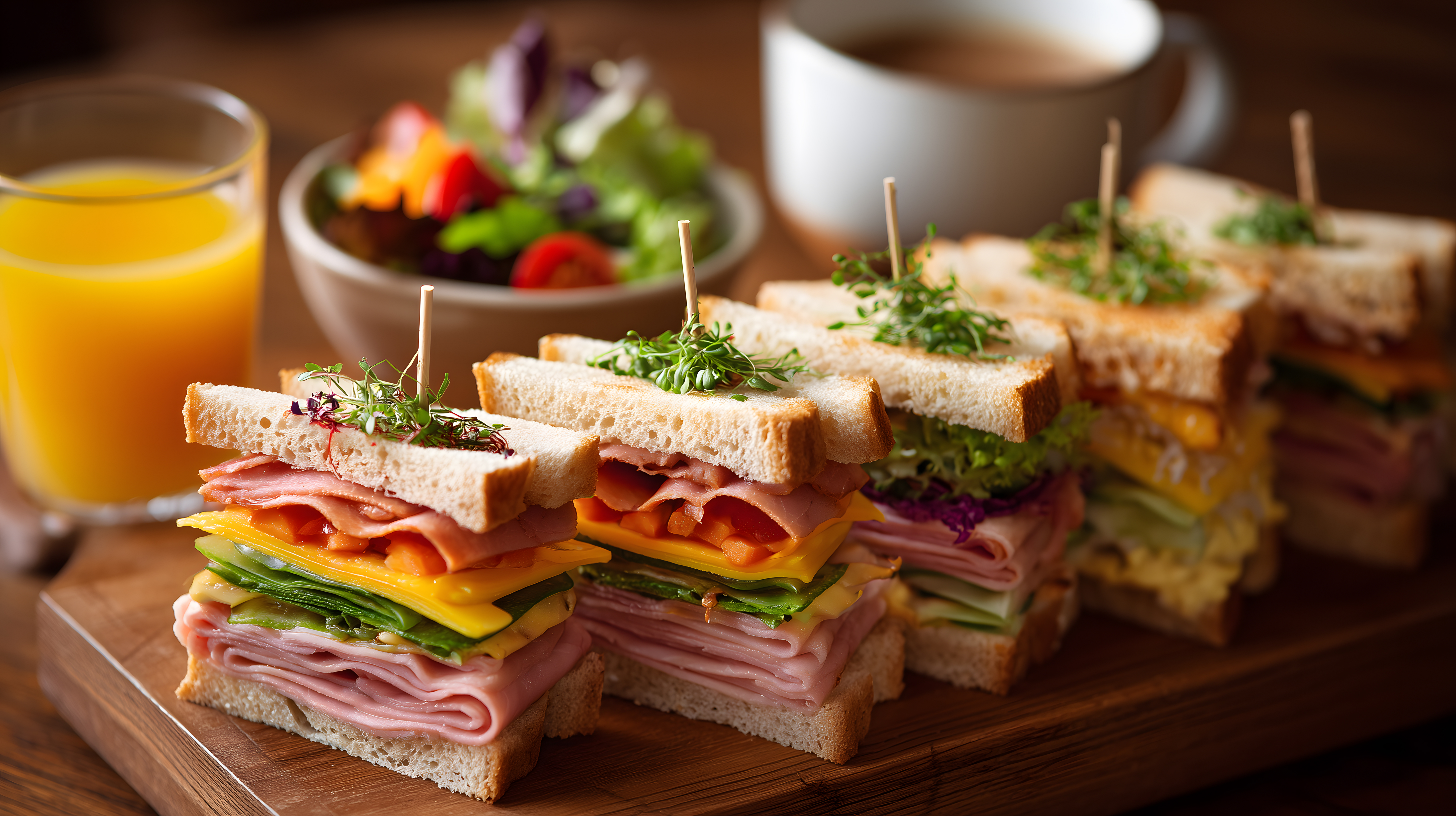 Das Bild zeigt ein delikates Sandwich, das mit frischen Zutaten wie Salat, Schinken und Käse gefüllt ist. Die Sandwich-Scheiben sind perfekt geschnitten und mit Kräutern garniert, was dem Gericht ein appetitliches Aussehen verleiht. Im Hintergrund sind ein Glas mit Orangensaft und ein Teller mit gemischtem Salat zu sehen, die zusammen ein leckeres und gesundes Frühstück oder Mittagessen ergeben.