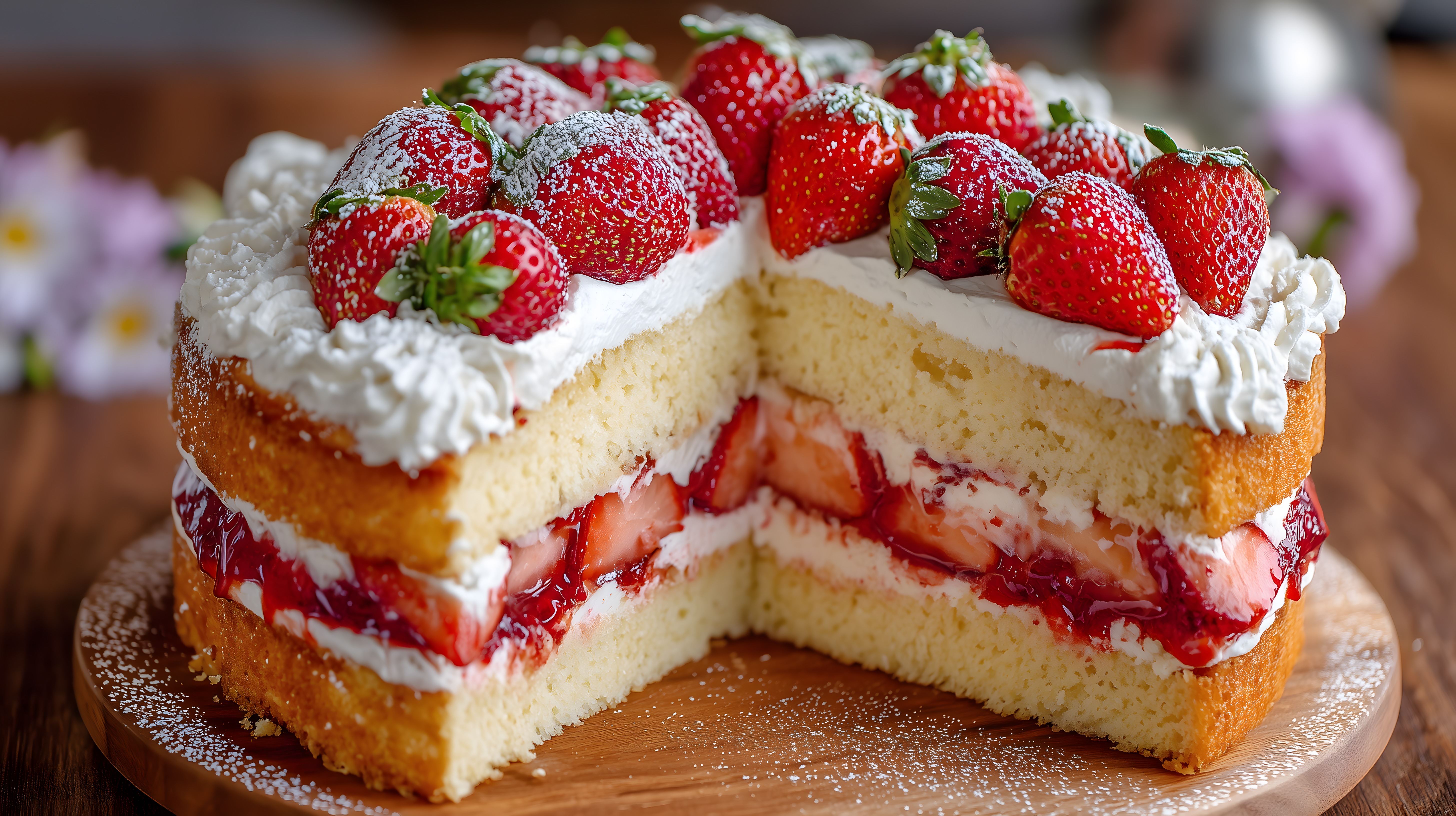 Das Bild zeigt einen leckeren Erdbeer-Biskuit-Kuchen auf einem hölzernen Teller. Der Kuchen ist mit frischen, roten Erdbeeren und einer Creme-Haube dekoriert. Die Erdbeeren sind glänzend und haben ein saftiges Aussehen, was den Appetit anregt. Der Kuchen hat eine schöne, goldene Oberfläche und ist in Scheiben geschnitten, um einen Blick auf den Innenteil zu gewähren.