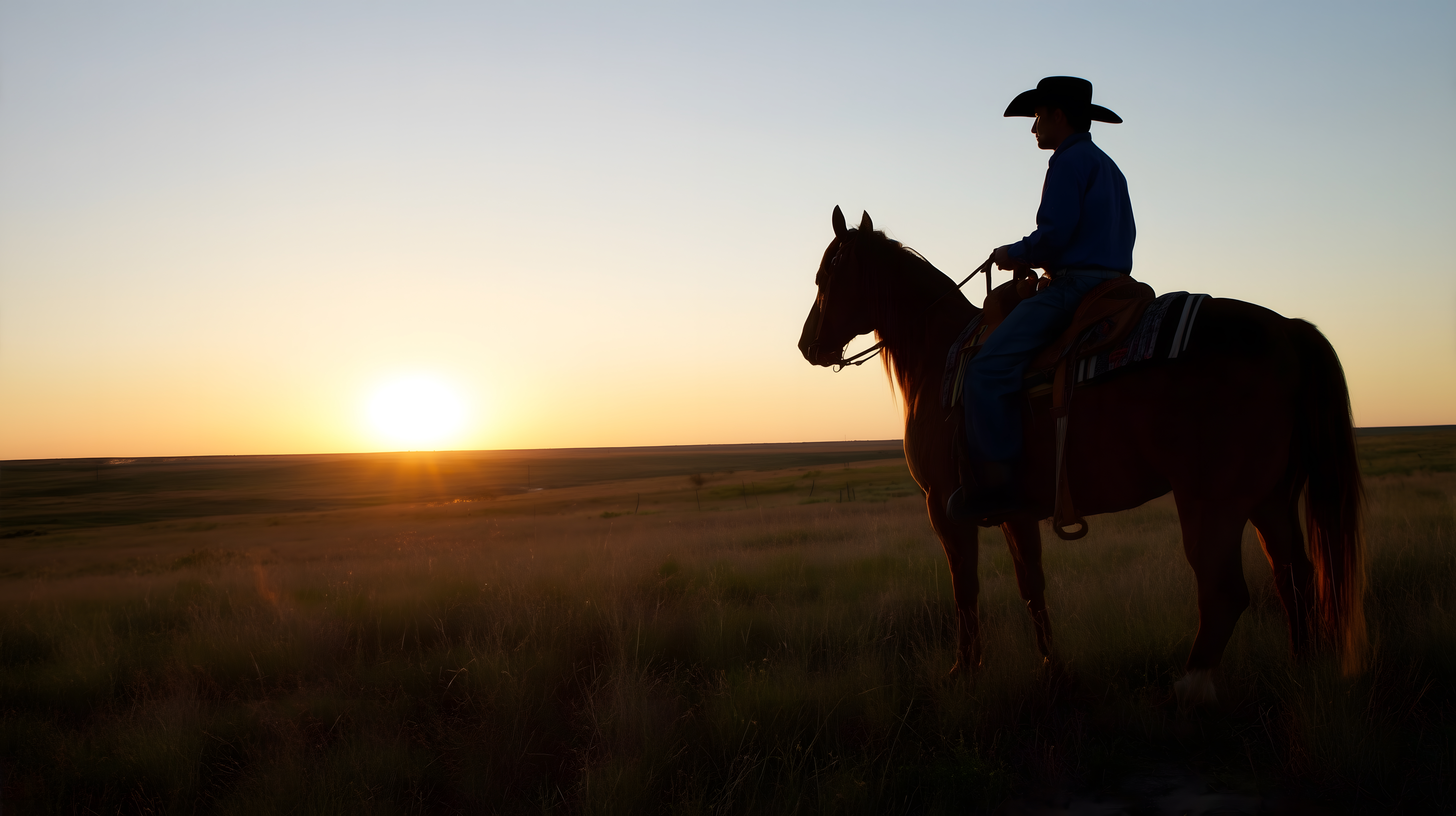 Das Bild zeigt einen Cowboy, der auf einem Pferd durch eine weite, offene Landschaft reitet, bei Sonnenuntergang. Die Silhouette des Reiters hebt sich deutlich vom orangefarbenen Himmel ab, was eine stimmungsvolle und ruhige Atmosphäre erzeugt. Die Komposition mit dem Horizont im unteren Drittel lenkt den Blick des Betrachters auf den einsamen Reiter, der die Weite des Geländes durchquert.