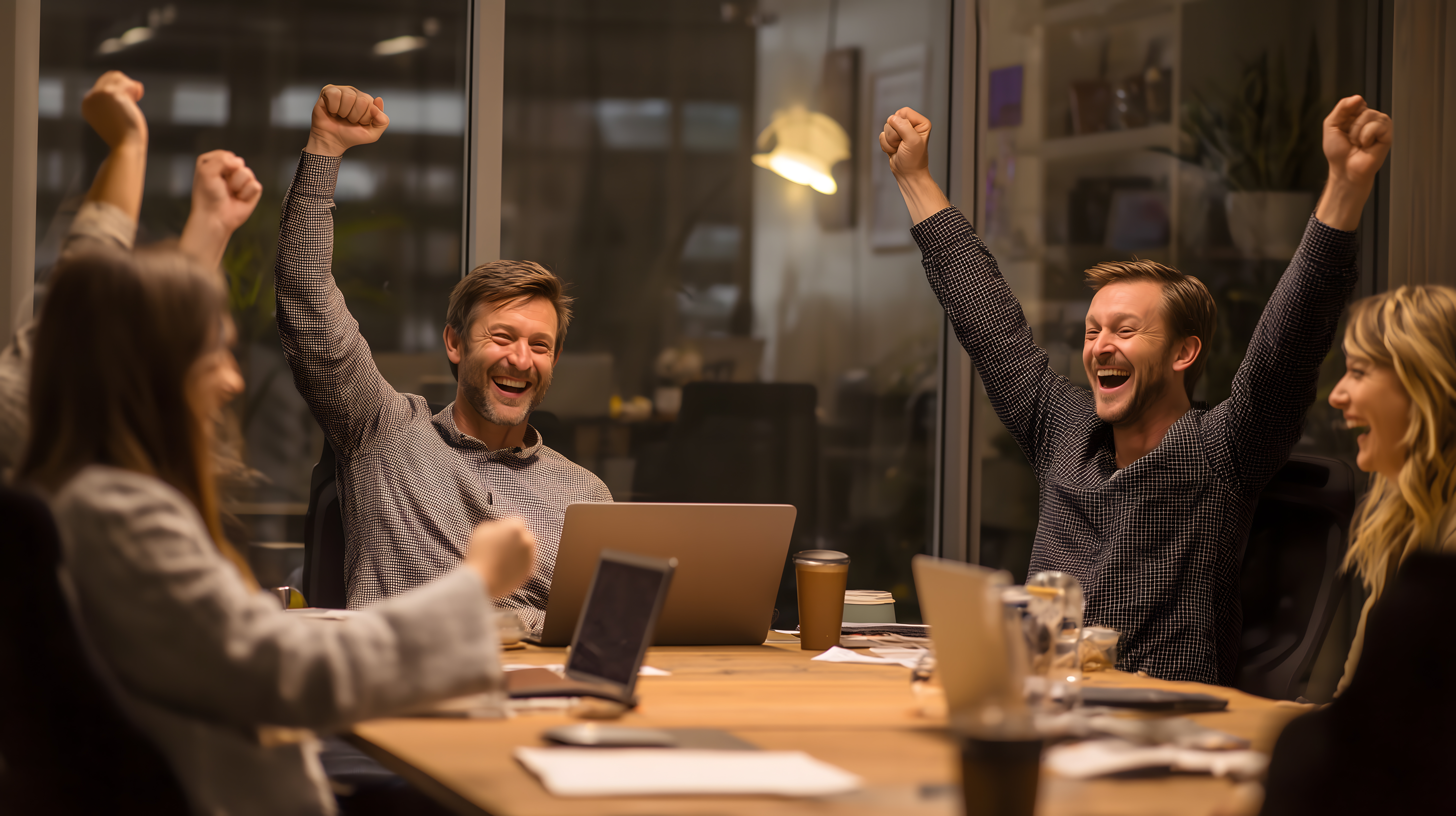 Das Foto zeigt eine Gruppe von fröhlichen Büromitarbeitern, die sich über einen Erfolg oder ein positives Ergebnis freuen. Im Vordergrund sitzen drei Personen an einem Holztisch, die ihre Arme triumphierend in die Luft recken und dabei laut lachen. Im Hintergrund sind weitere Personen zu sehen, die ebenfalls begeistert reagieren. Die Szene ist in einem modernen, industriell anmutenden Büroraum mit großen Fenster-fronten aufgenommen, was eine helle und freundliche Atmosphäre schafft.