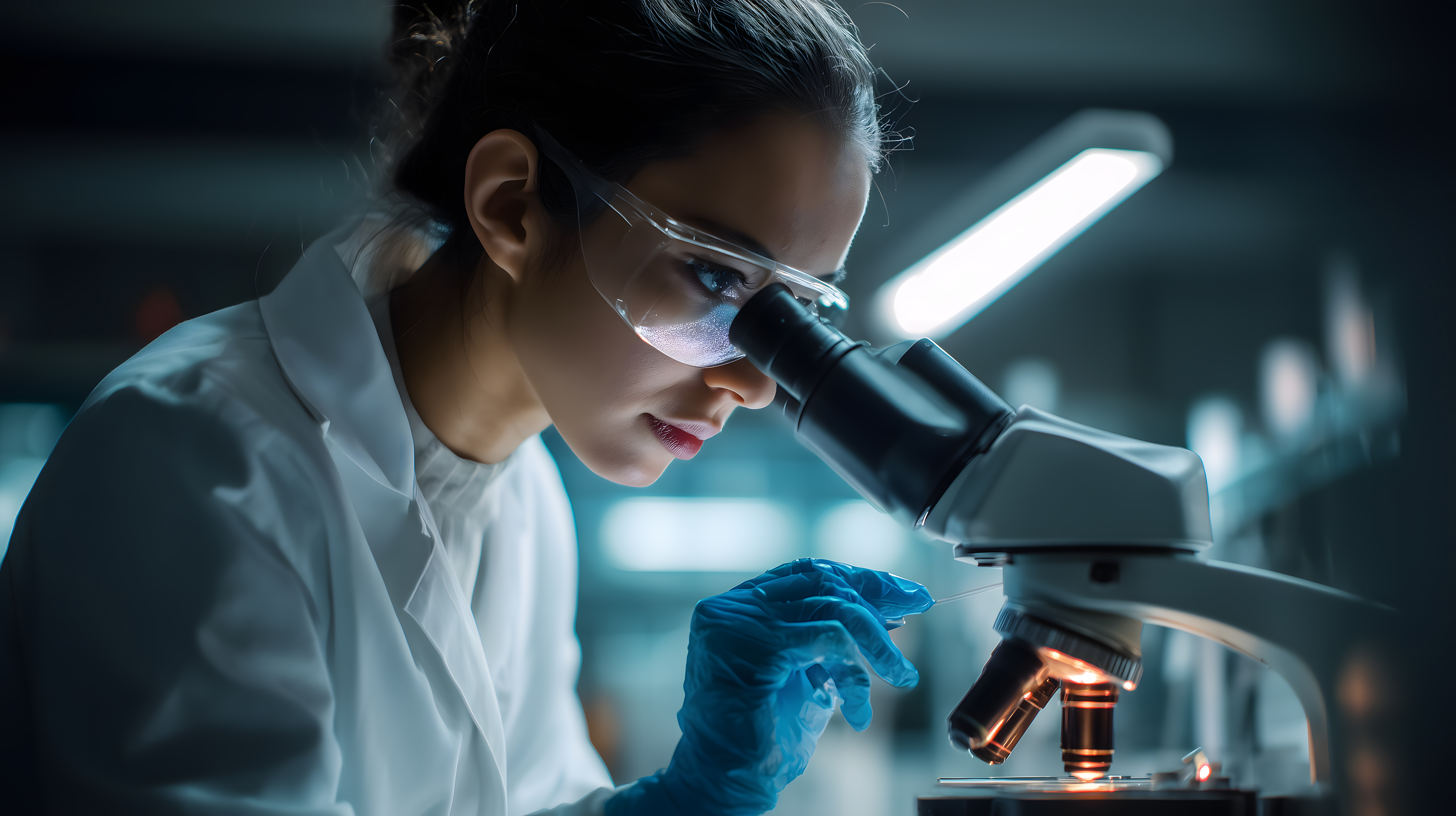Das Bild zeigt eine Nahaufnahme einer Frau, die durch ein Mikroskop blickt. Sie trägt einen weißen Laborkittel und blaue Gummihandschuhe, was auf eine Umgebung in einem Forschungslabor oder einer Klinik hindeutet. Die Beleuchtung ist dunkel und blau-grünlich, was eine professionelle, technische Atmosphäre erzeugt.
