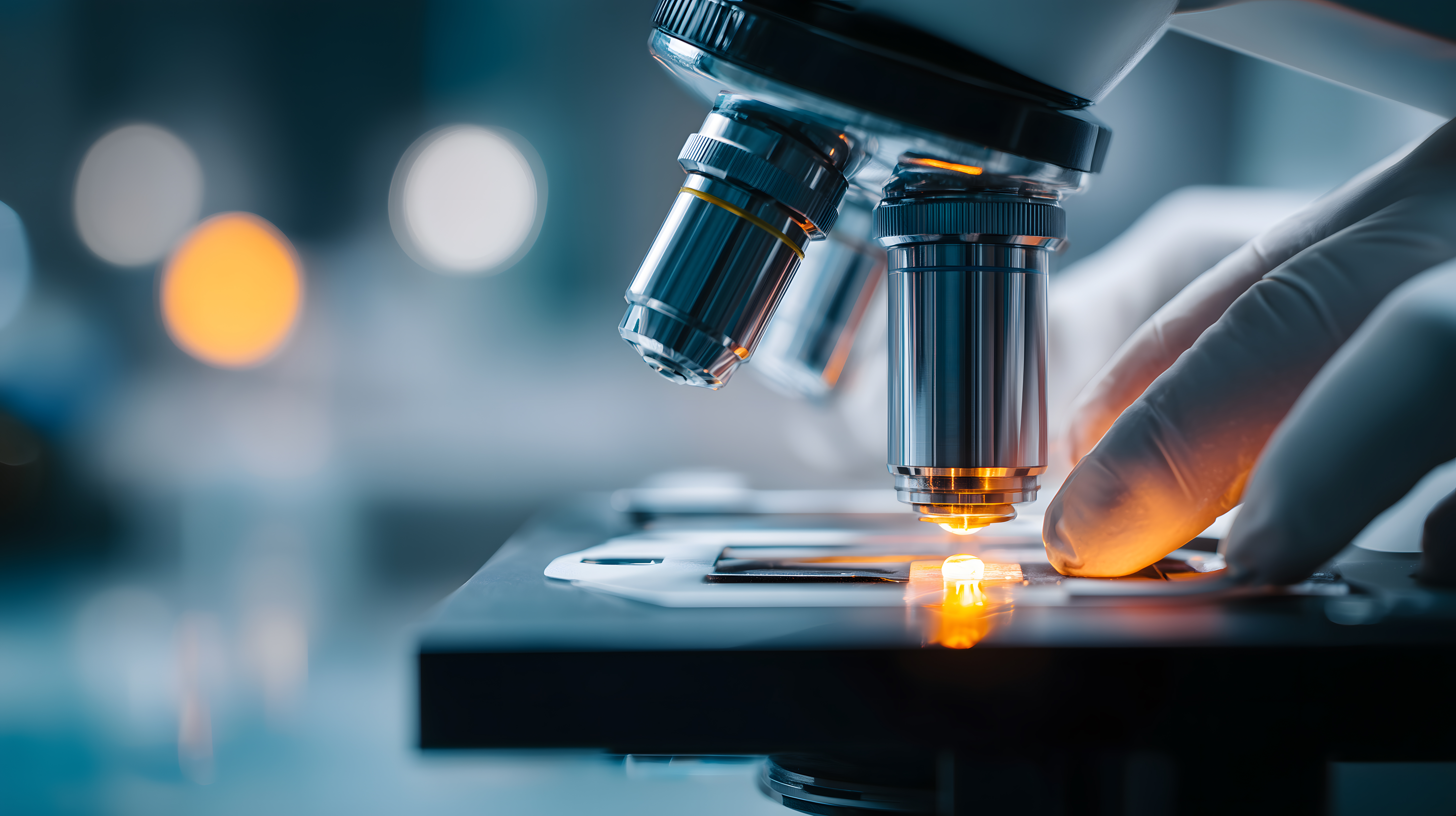 Das Bild zeigt einen Mikroskop-Objektträger, auf dem sich ein Objekt befindet, das von einem modernens Mikroskop scharf abgebildet wird. Der Fokus liegt auf dem Okular des Mikroskops, das im Vordergrund platziert ist. Die Farbpalette ist überwiegend blau und orange, was dem Bild einen dunklen, stimmungsvollen Charakter verleiht.