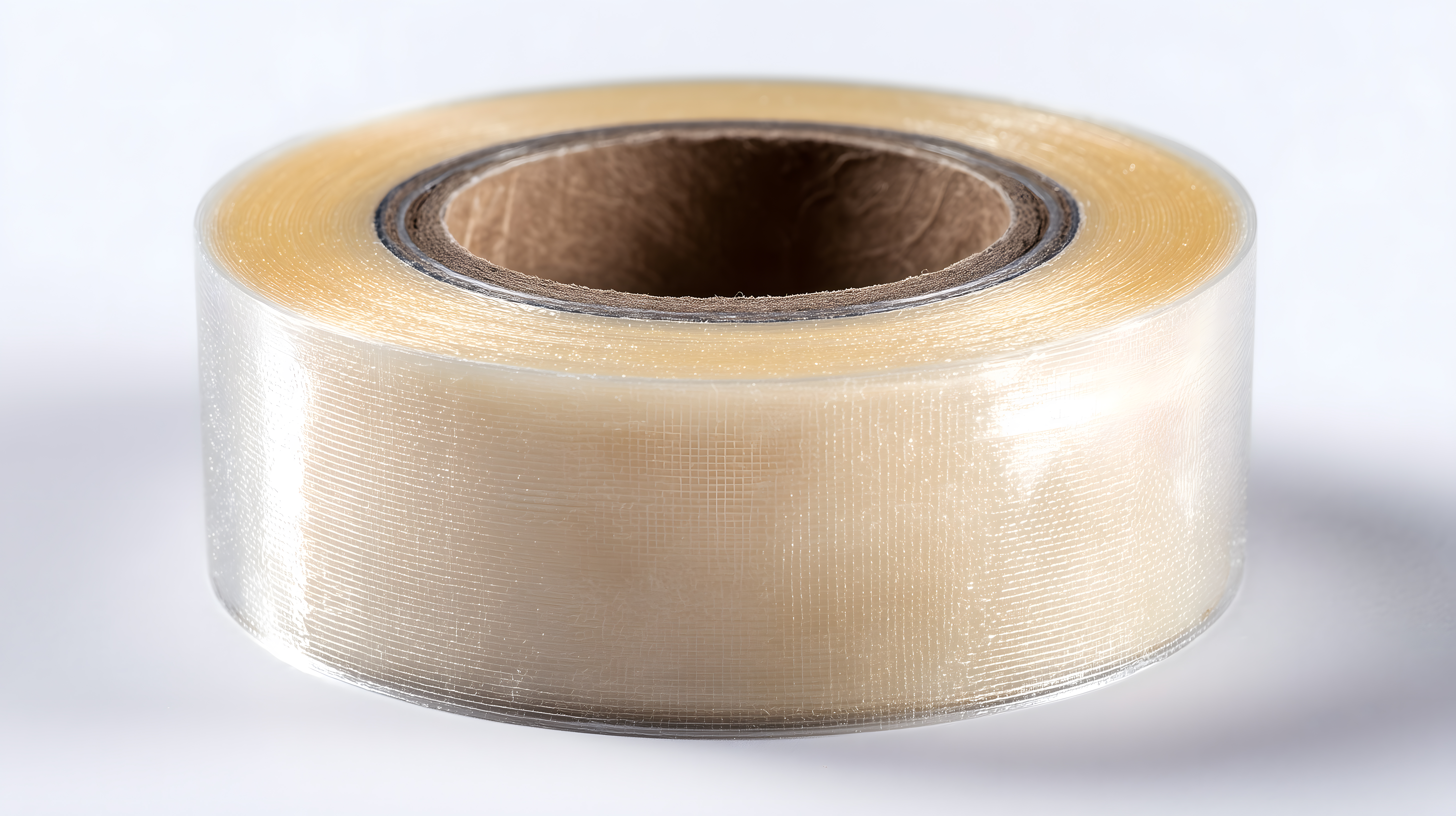 Das Bild zeigt eine Nahaufnahme einer Rolle transparenter Klebebandstreifen. Die zylindrische Form des Produkts ist klar erkennbar, und die Aufnahme bietet einen detaillierten Blick auf die Oberfläche, die eine feine, gleichmäßige Textur aufweist. Die Farben des Bildes sind hauptsächlich in Nuancen von Beige und Braun gehalten, was eine neutrale, professionelle Atmosphäre schafft.