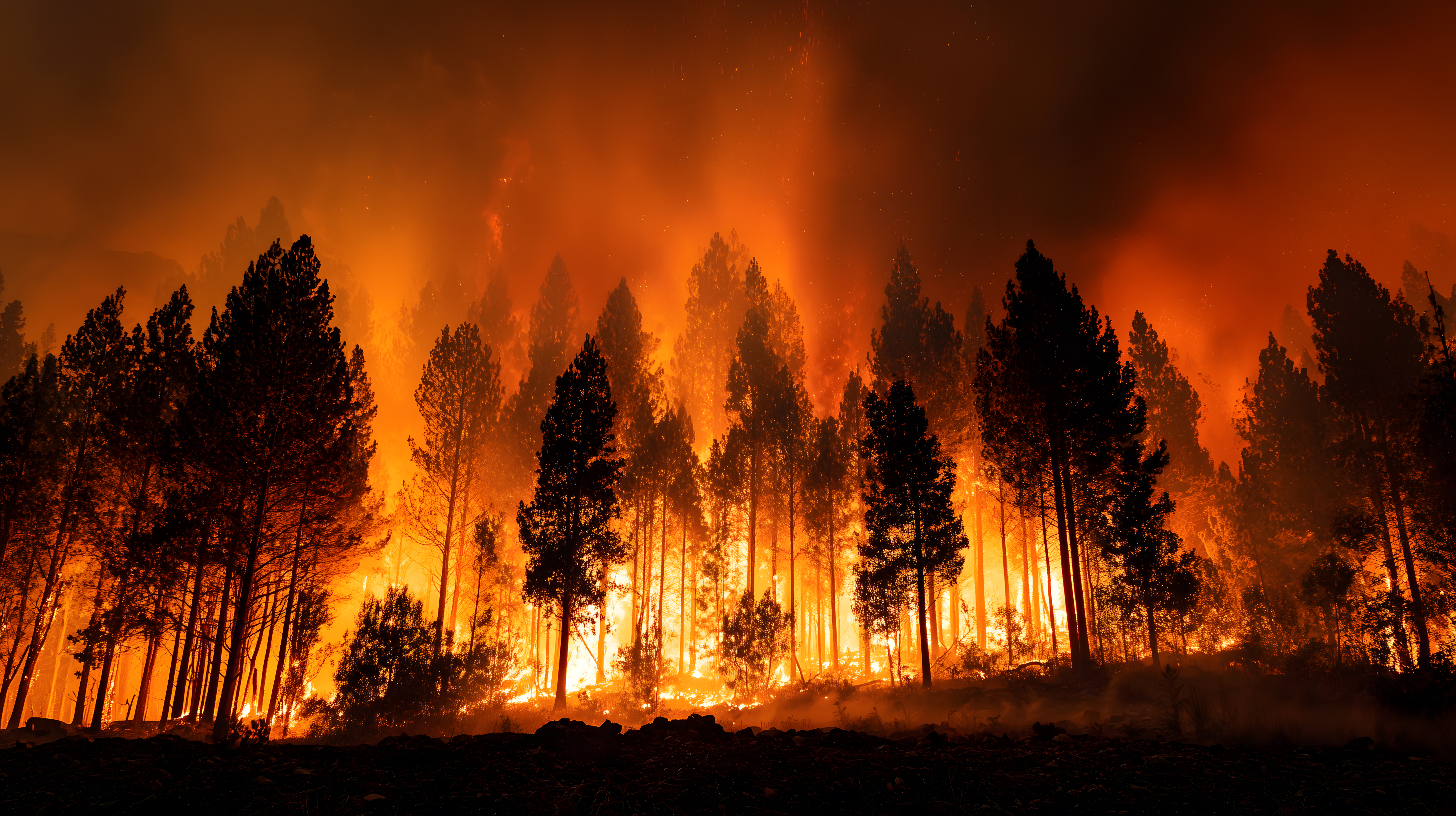 Das Bild zeigt eine dramatische Waldszene, die von einem heftigen Waldbrand erfasst wird. Die Kamera erfasst die Szenerie aus einer niedrigen Perspektive, wodurch die Intensität des Feuers noch verstärkt wird. Die Farbpalette dominiert in Rottönen, die den Eindruck von Gefahr und Zerstörung vermitteln. Die Komposition ist geprägt von einer Vielzahl hoher, brennender Bäume, die eine bedrohliche und düstere Atmosphäre schaffen.