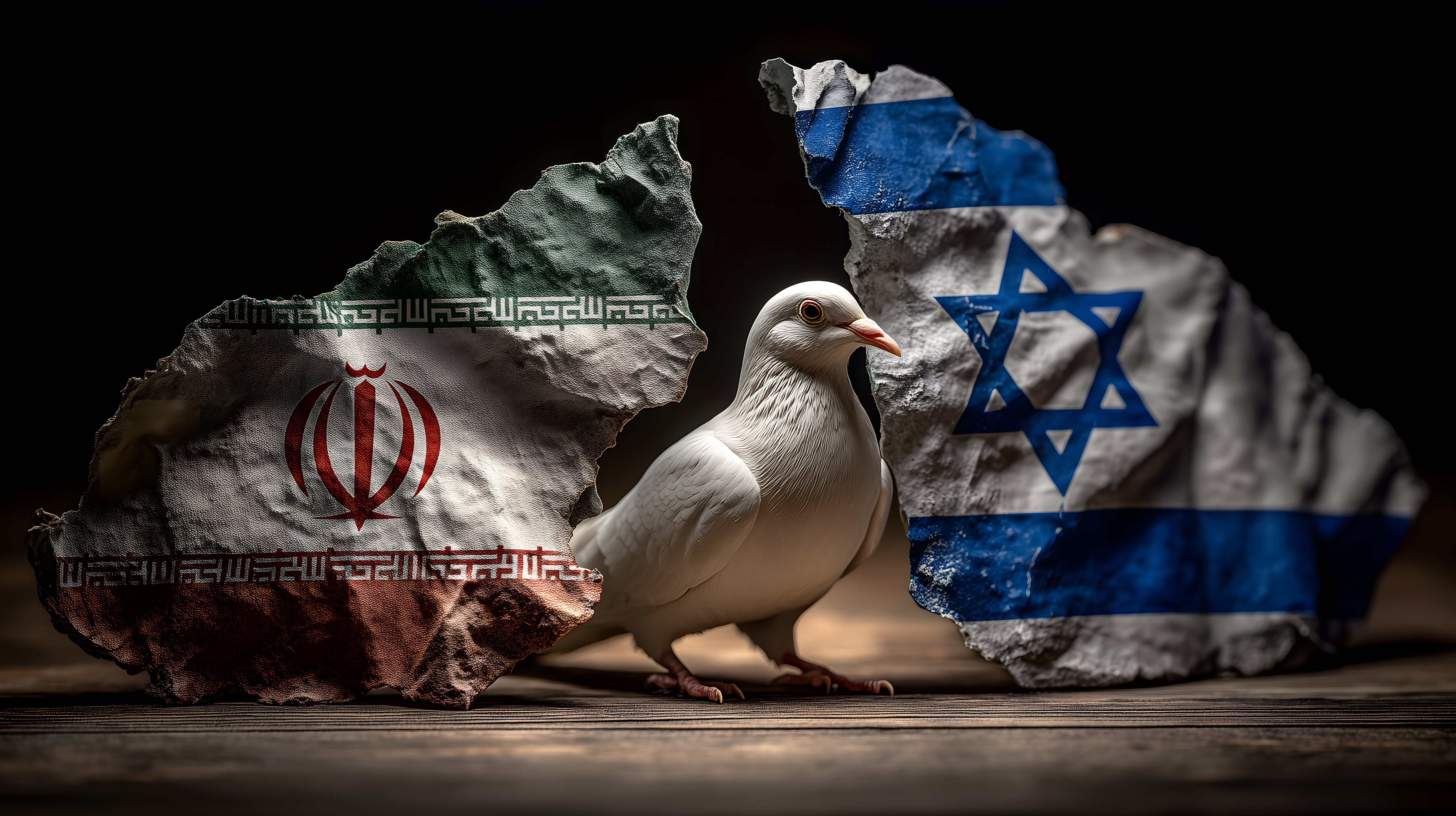 Das Bild zeigt eine weiße Taube, die sich zwischen Flaggen des Iran und Israels befindet. Der Kontrast der Farben und Symbole schafft eine beeindruckende visuelle Spannung. Die Komposition mit der Taube als Fokuspunkt und den Flaggen im Hintergrund verleiht dem Bild eine symbolische Tiefe. Die dunkle Umgebung hebt die Taube und die Flaggen deutlich hervor, was die Aufmerksamkeit des Betrachters auf die zentrale Botschaft des Bildes lenkt.