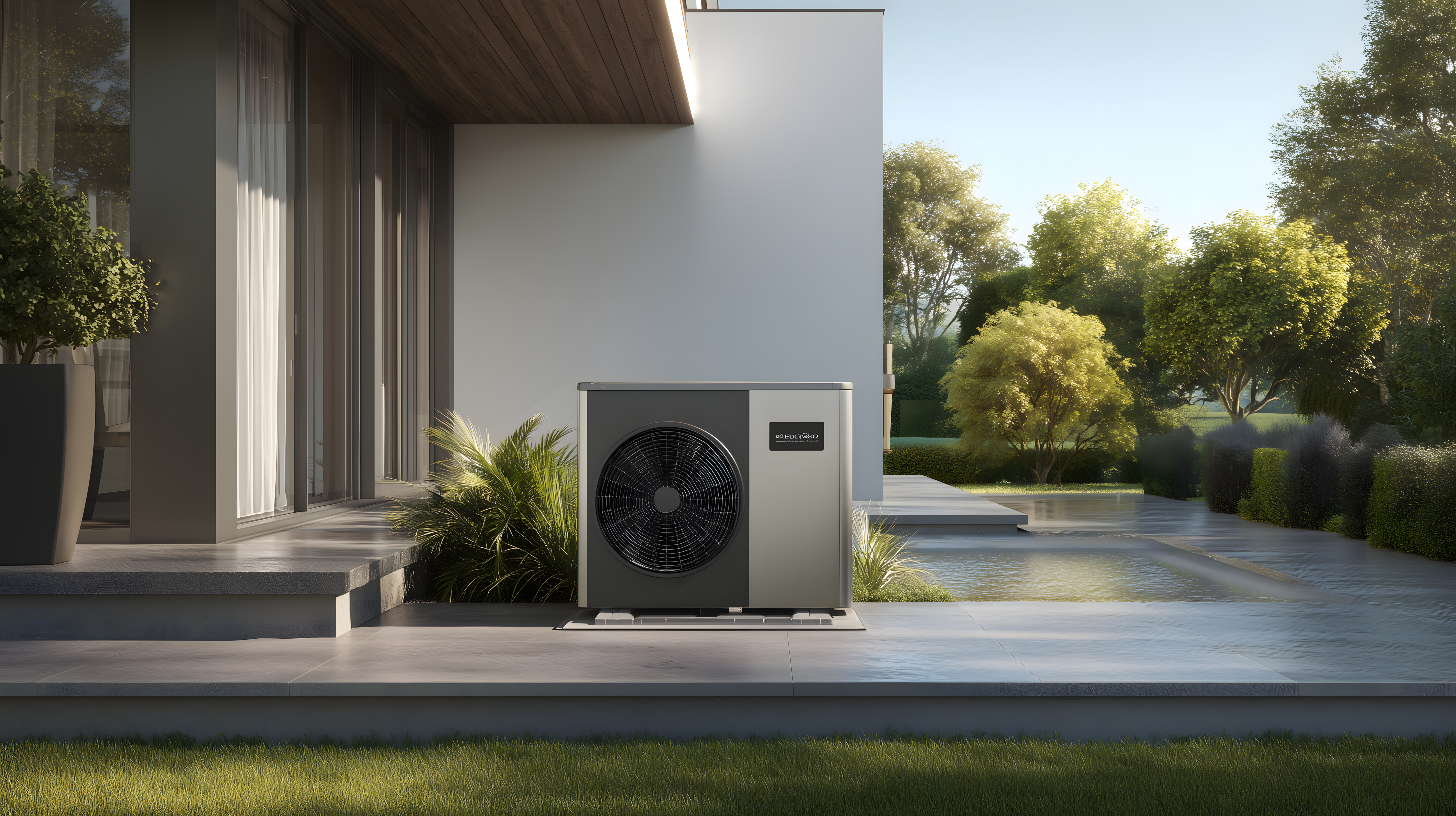 Die Perspektive des Fotos ist leicht erhöht, sodass der Betrachter einen Überblick über die gesamte Szenerie erhält. Die Farbpalette ist zurückhaltend und besteht hauptsächlich aus Grautönen, Braun- und Grüntönen, die eine ruhige und harmonische Atmosphäre schaffen. Die Komposition des Bildes ist ausgewogen und lenkt den Blick des Betrachters gezielt auf das Wärmepumpengerät als Hauptmotiv.