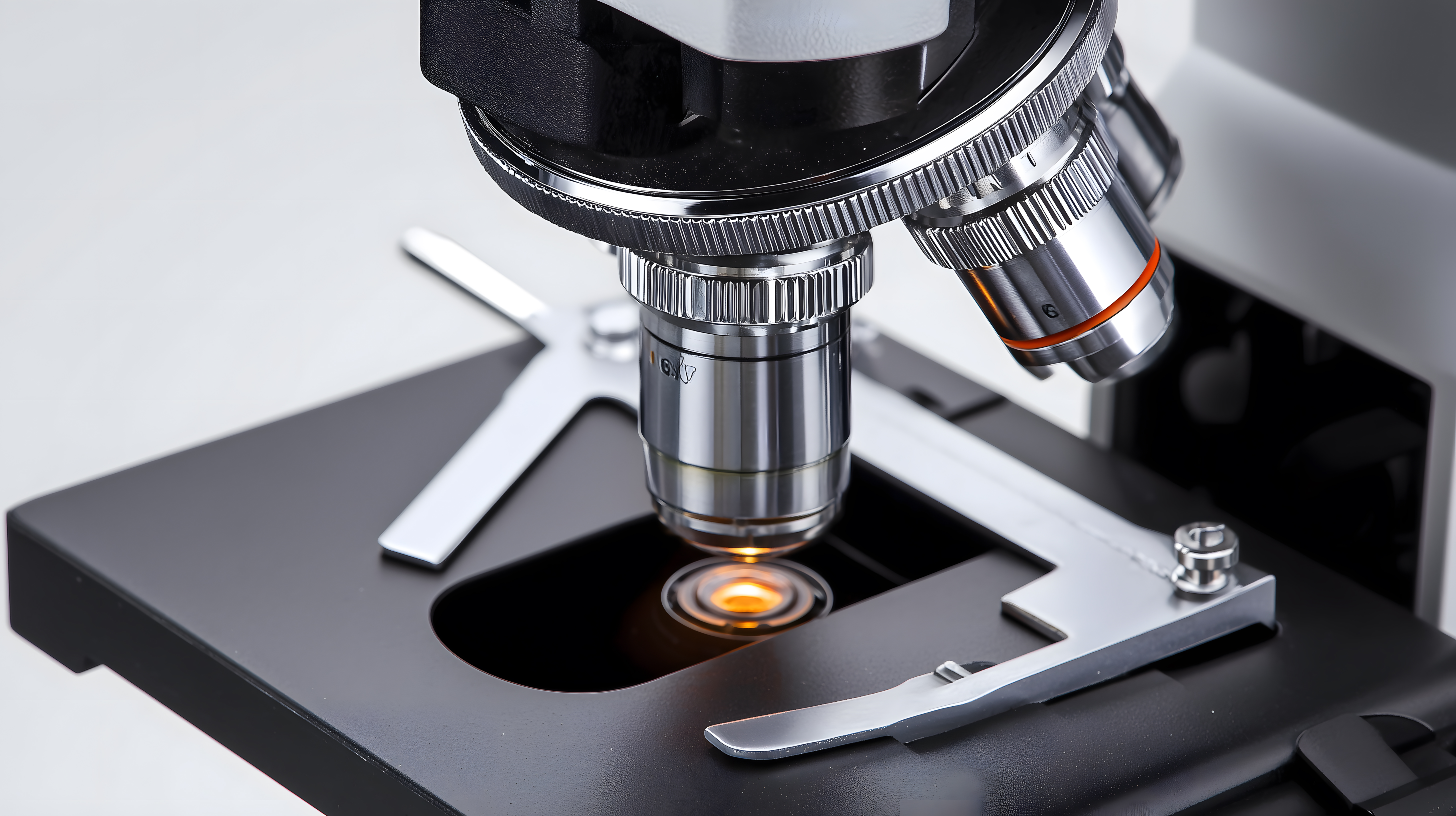 Dieses Foto zeigt einen modernen Mikroskop-Aufbau in einer minimalistischen, dunklen Umgebung. Der Fokus liegt auf dem Okular des Instruments, das in seiner Mitte ein leuchtendes, oranges Licht strahlt. Die Oberfläche des Mikroskops ist mit hochglänzenden, silbernen Metallelementen und einer strukturierten Belüftung versehen, was auf eine hochwertige Verarbeitung hindeutet.