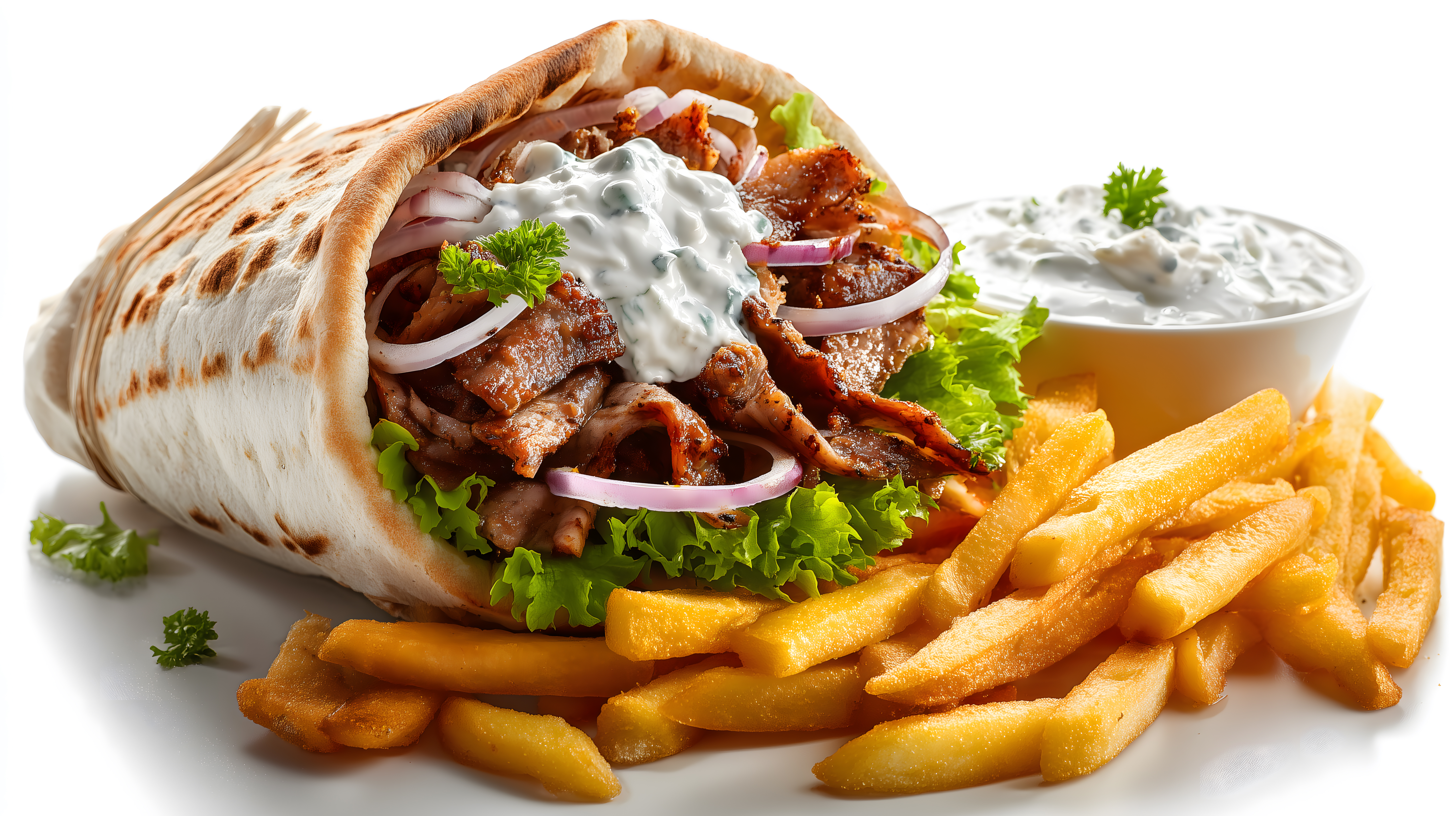 Das Bild zeigt einen appetitlichen Döner, der auf einem weißen Teller angerichtet ist. Der Döner ist mit würzigem Fleisch, frischen Salatzutaten und einem cremigen Joghurt-Dressing gefüllt. Neben dem Döner sind knusprige Pommes frites und eine Portion Dip-Soße zu sehen, die das Gesamtbild abrunden.