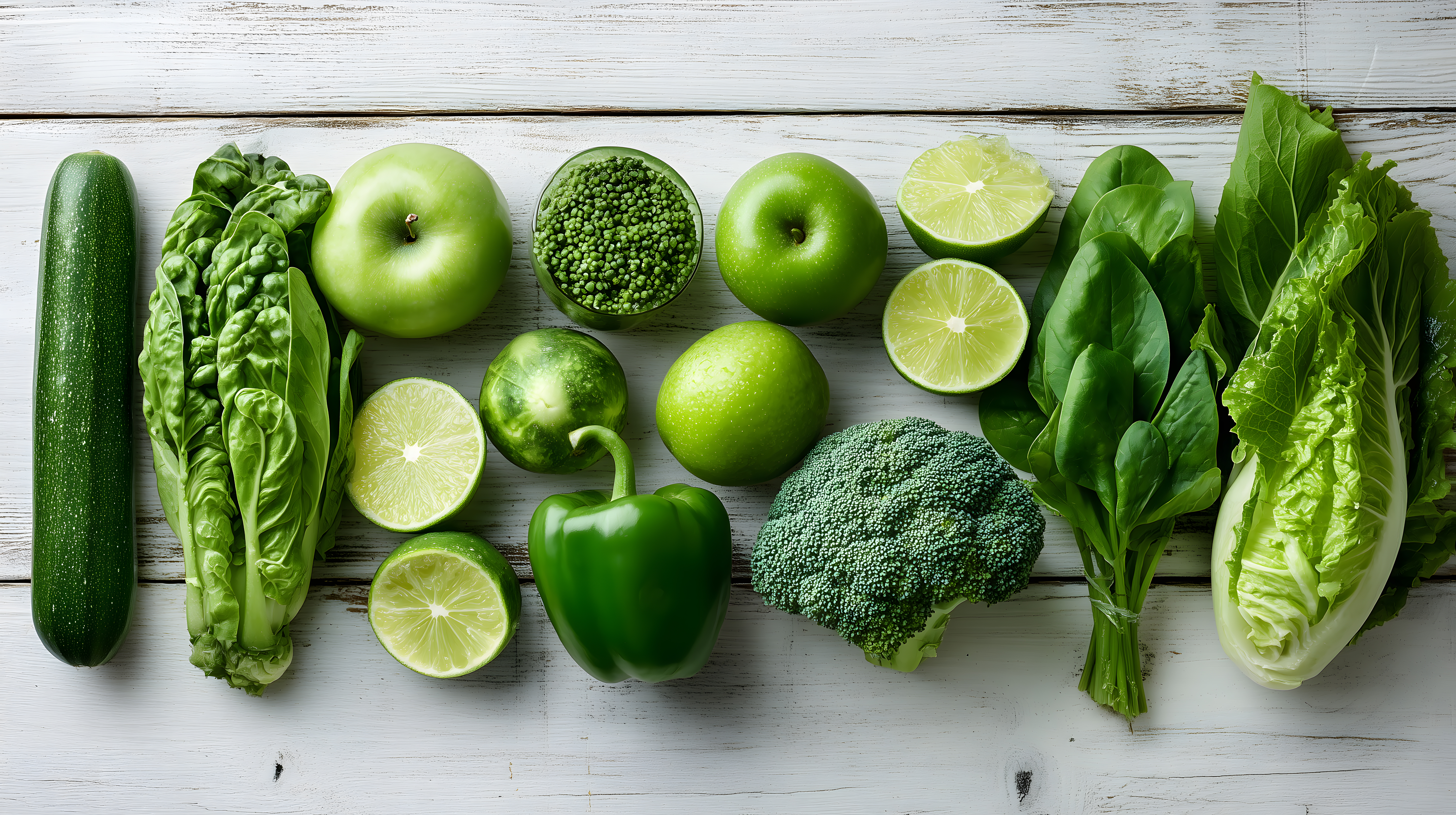 Das Foto zeigt eine Vielzahl von grünen, gesunden Lebensmitteln auf einem weißen Holztisch. Aus der Draufsicht sind verschiedene Früchte und Gemüsesorten, darunter Äpfel, Limetten, Brokkoli, Spinat und Zucchini, sorgfältig angeordnet. Die Farbpalette konzentriert sich auf unterschiedliche Grüntöne, die eine frische und natürliche Atmosphäre schaffen.