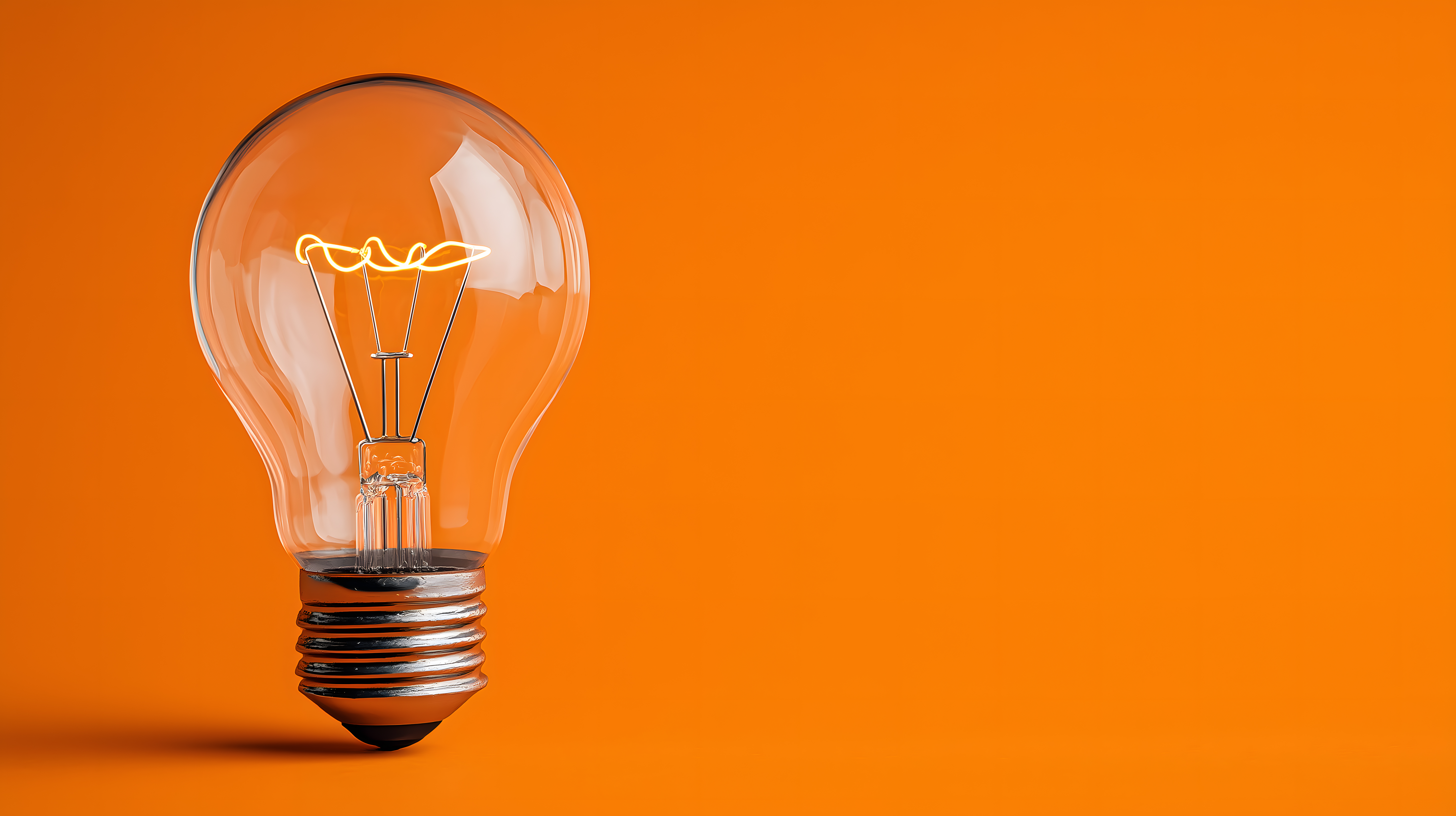 Das Bild zeigt eine Glühbirne vor einem orange-farbigen Hintergrund. Die Perspektive ist eine Nahaufnahme, die den Fokus auf das Objekt legt. Die Farbpalette ist stark kontrastierend, mit dem leuchtenden Orange als Hauptfarbe und der transparenten Glühbirne als Blickfang.