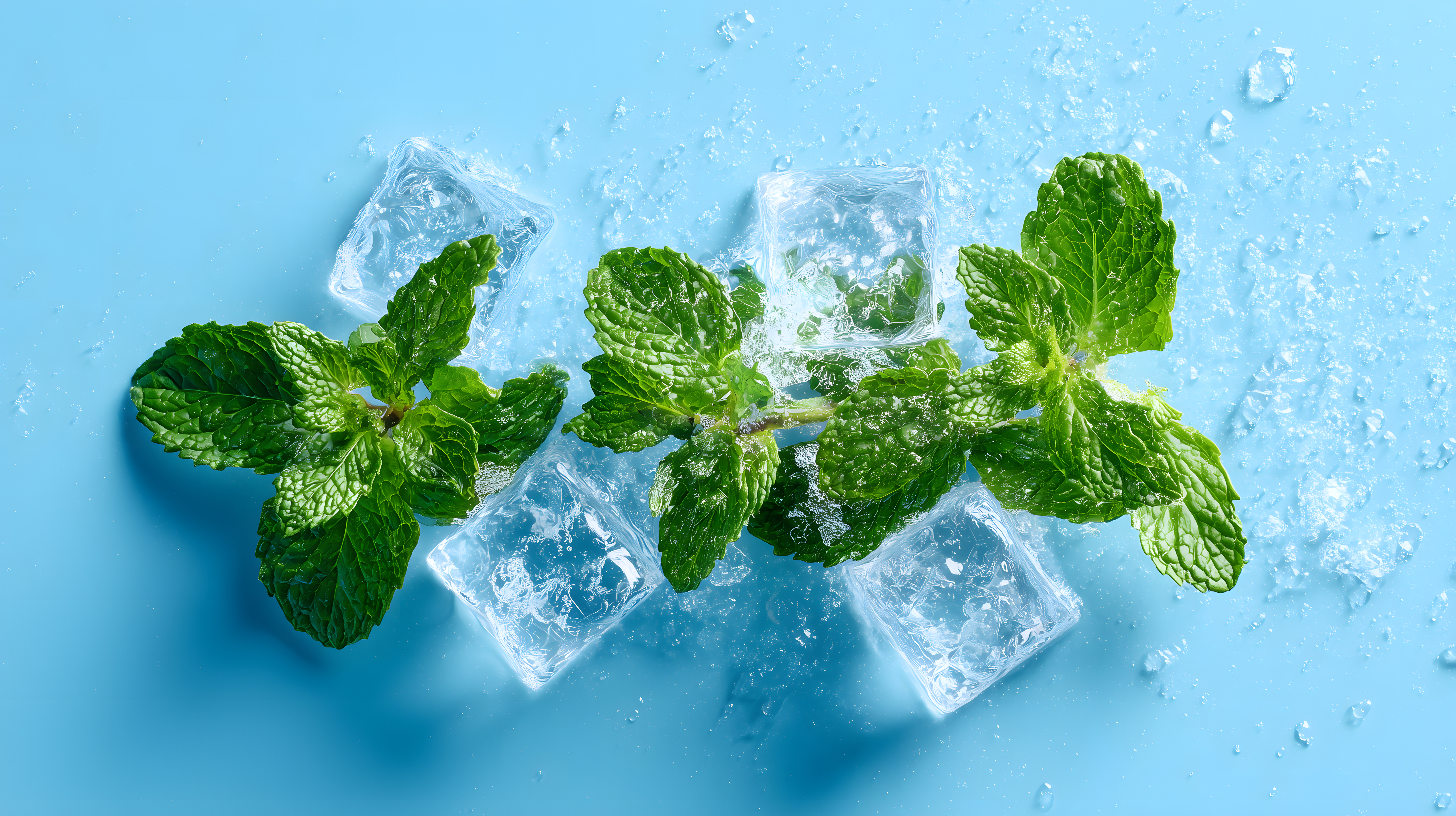 Das Foto zeigt eine Nahaufnahme von frischer Minze, die auf einem hellblauen Hintergrund mit Eiswürfeln platziert ist. Die grünen Blätter der Minze bilden einen lebendigen Kontrast zu den transparenten Eiswürfeln, was eine erfrischende und klare Atmosphäre vermittelt. Die Draufsicht-Perspektive legt den Fokus auf die natürlichen Formen und Strukturen der Minze, die durch die Eiswürfel noch zusätzlich betont werden.