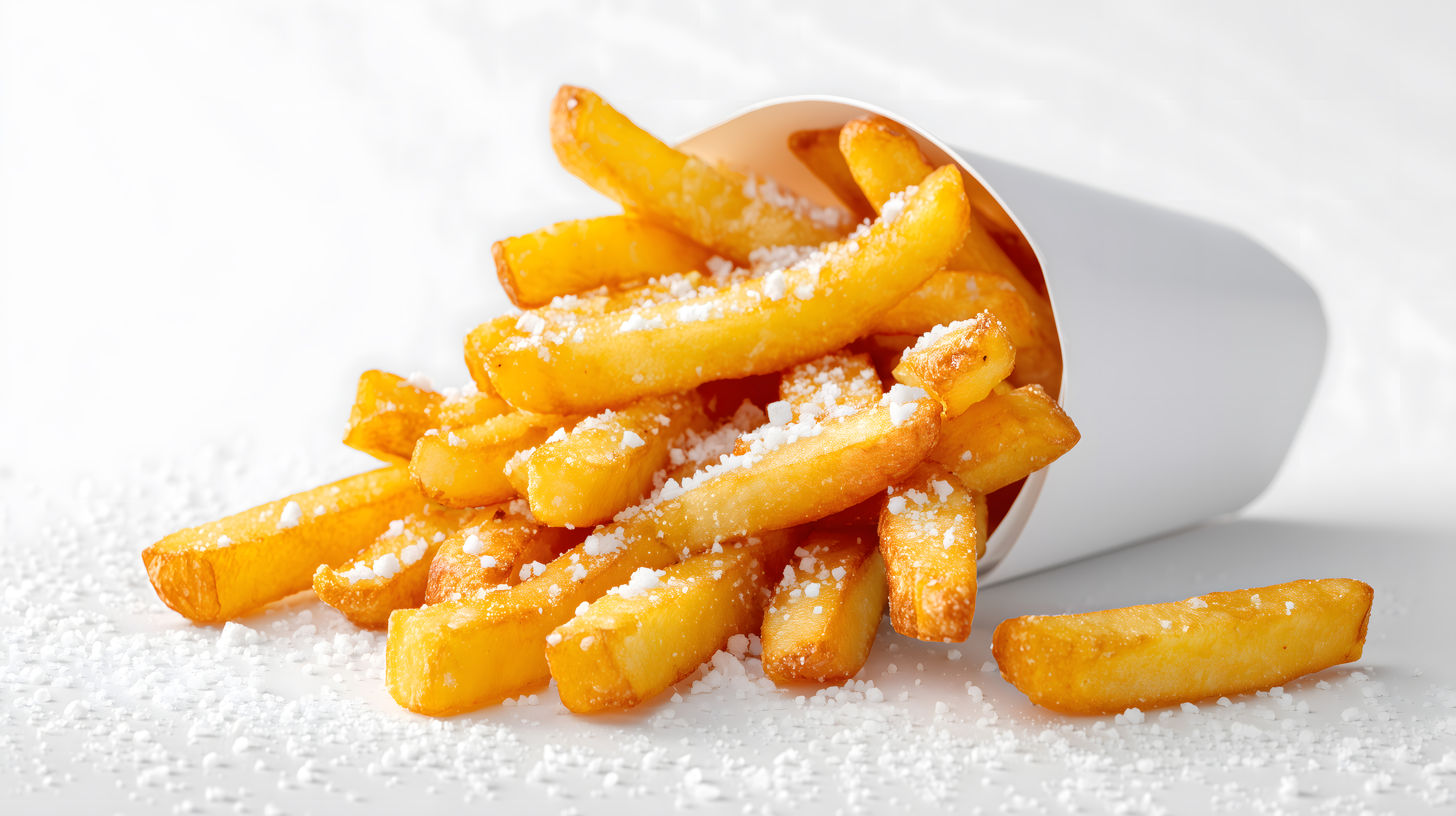 Das Foto zeigt eine Nahaufnahme von knusprigen, goldbraunen Pommes frites, die in einer weißen Papiertüte angerichtet sind. Die Pommes sind mit einer feinen Schicht Salz bestreut, was einen appetitlichen Kontrast zu ihrer leuchtend gelben Farbe erzeugt. Das Arrangement vermittelt eine frisch zubereitete, leckere Mahlzeit.