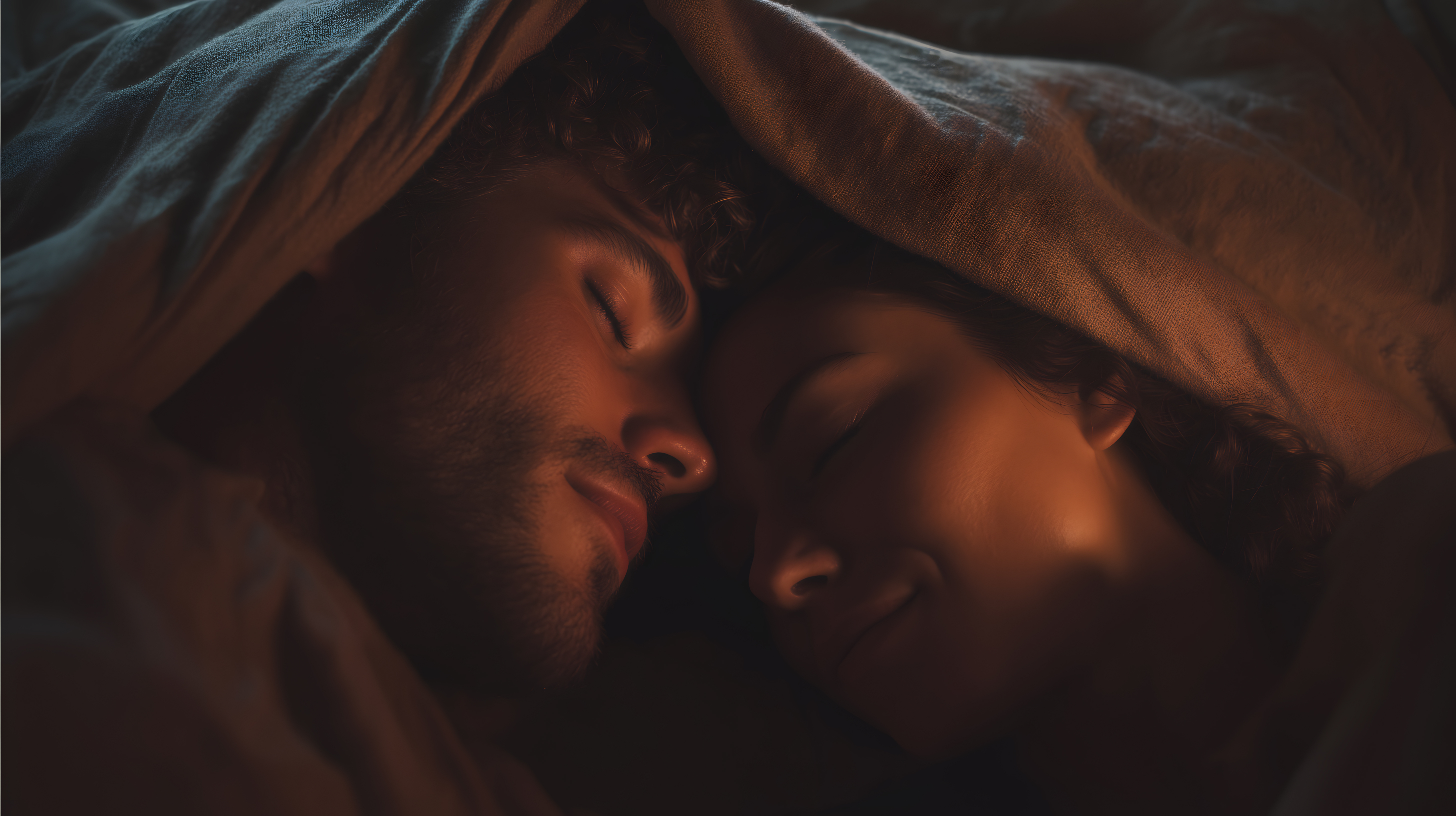 Das Foto zeigt zwei Menschen, die eng aneinander kuscheln und in einem Bett schlafen. Die Perspektive ist eine Nahaufnahme, die den Fokus auf ihre Gesichter und die Intimität der Szene lenkt. Die Farbpalette ist warm und dunkel, mit Braun- und Orangetönen, die eine gemütliche und entspannte Atmosphäre schaffen.