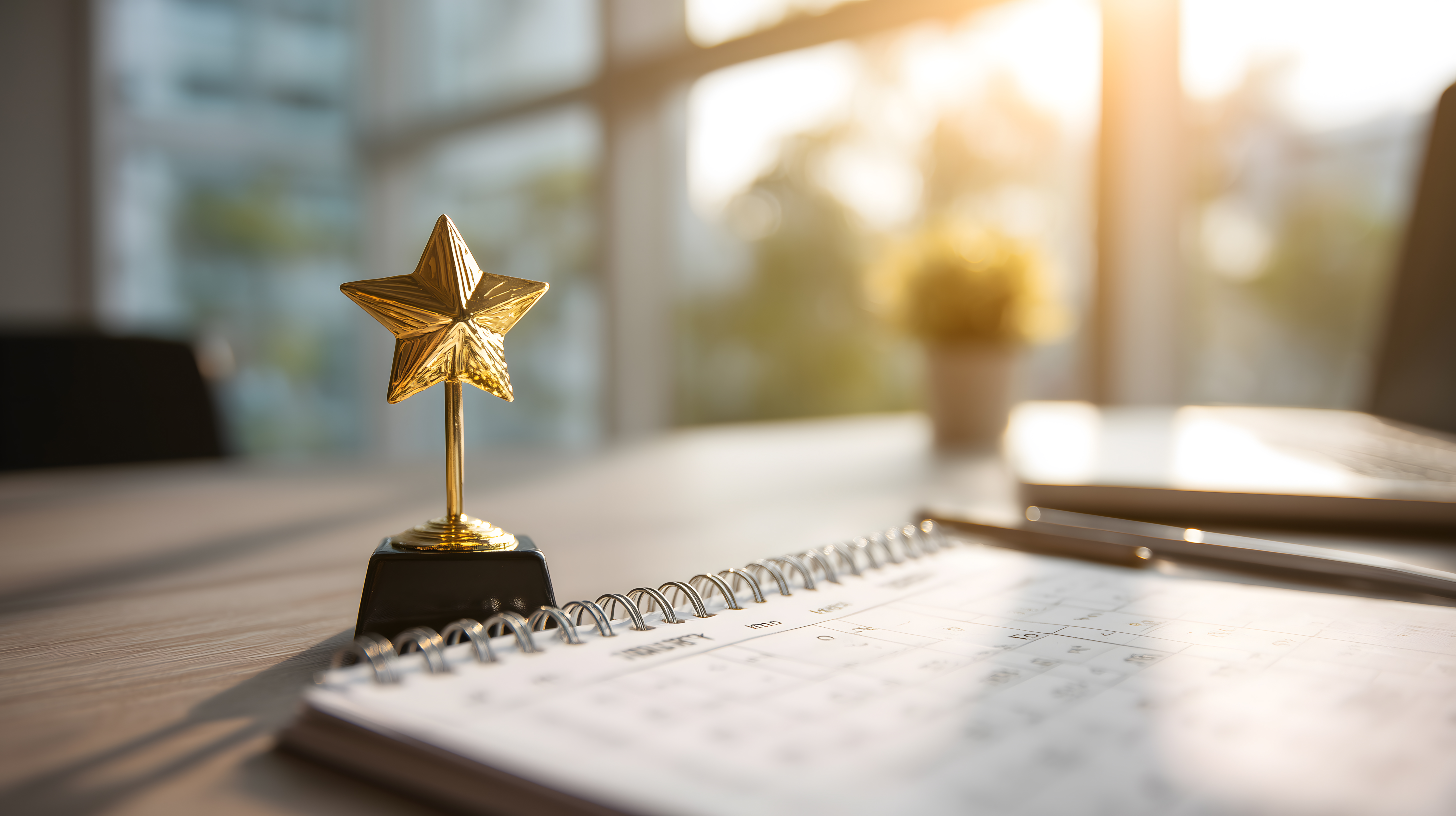 Das Bild zeigt einen goldenen Stern-Trophäenpokal, der auf einem Notizbuch mit Spiralbindung steht. Der Hintergrund ist unscharf und zeigt einen hellen Lichteinfall, der eine warme und feierliche Stimmung erzeugt. Die Perspektive ist eine Draufsicht, die den Fokus auf das zentrale Objekt, den Stern, lenkt. Die Farbpalette besteht hauptsächlich aus Goldtönen und Grautönen, was dem Bild eine elegante und hochwertige Ausstrahlung verleiht.