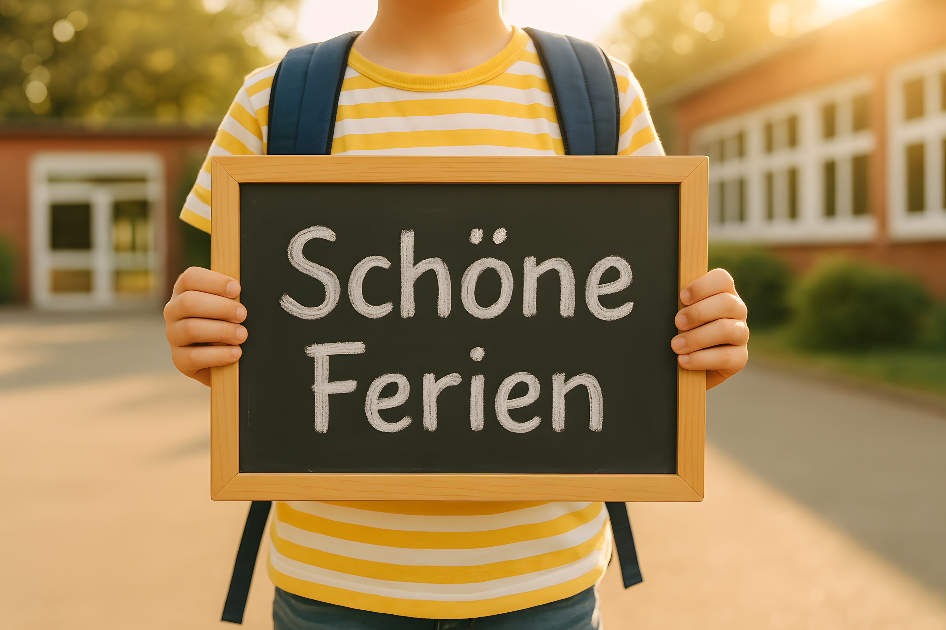 Das Bild zeigt einen jungen Mann, der ein Schild mit der Aufschrift "Schöne Ferien" in den Händen hält. Er trägt ein gelb-weiß gestreiftes T-Shirt und einen Rucksack, was auf einen Schüler oder Studenten hinweist. Der Hintergrund ist verschwommen, was den Fokus auf das Schild lenkt.
