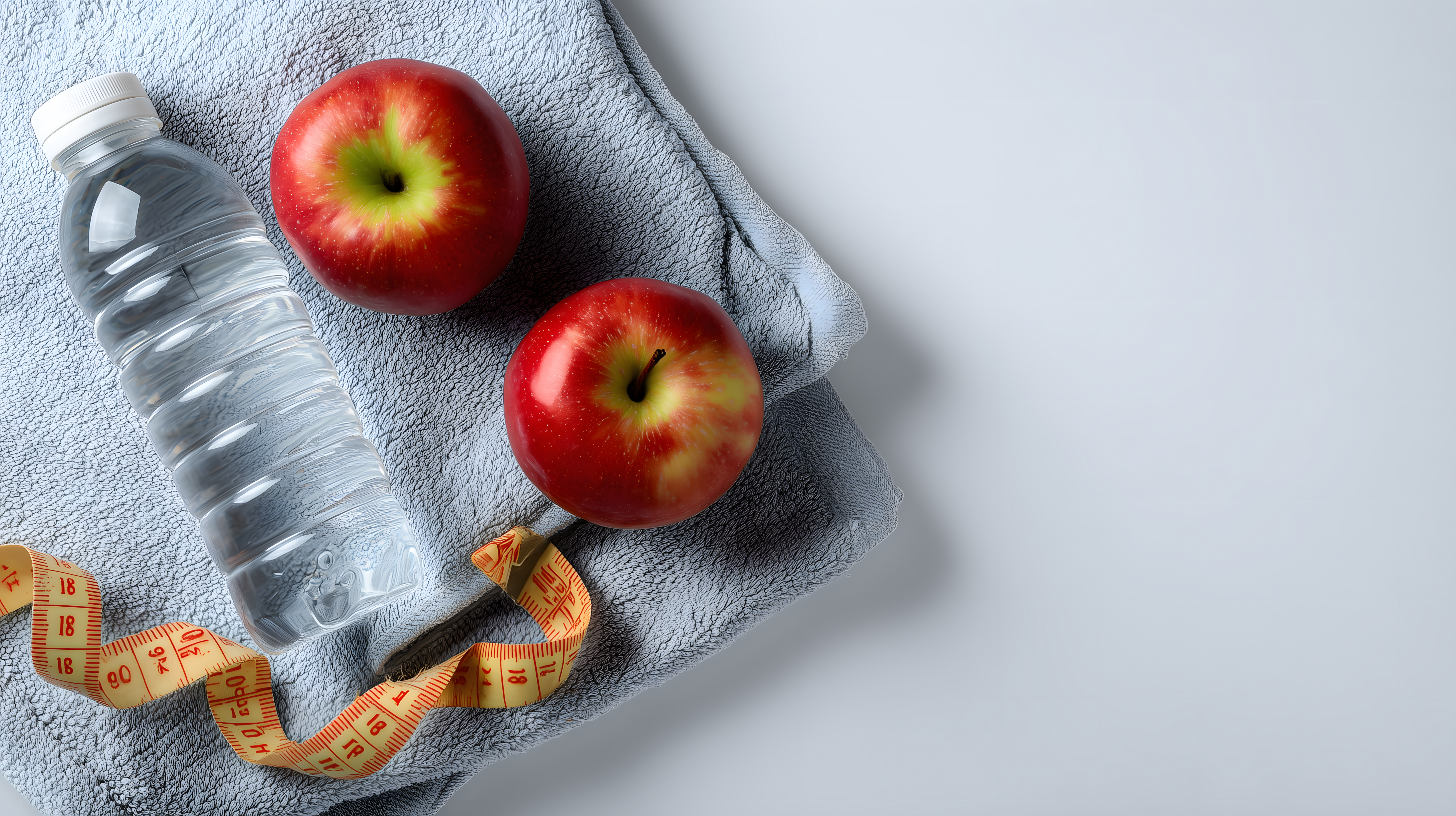 Das Bild zeigt eine Draufsicht auf einen gesunden Lebensstil. Es sind zwei rote Äpfel, eine Flasche Trinkwasser und ein orangefarbenes Maßband zu sehen, die auf einem grauen Handtuch platziert sind. Die Komposition ist minimalistisch und betont den Fokus auf die Objekte. Die Farbpalette ist reduziert, mit warmen Rottönen der Äpfel und dem kühlen Grau des Handtuchs. Das Bild könnte ideal für Blogbeiträge, Newsletter oder Social-Media-Posts im Bereich Gesundheit, Fitness und Wellness verwendet werden.