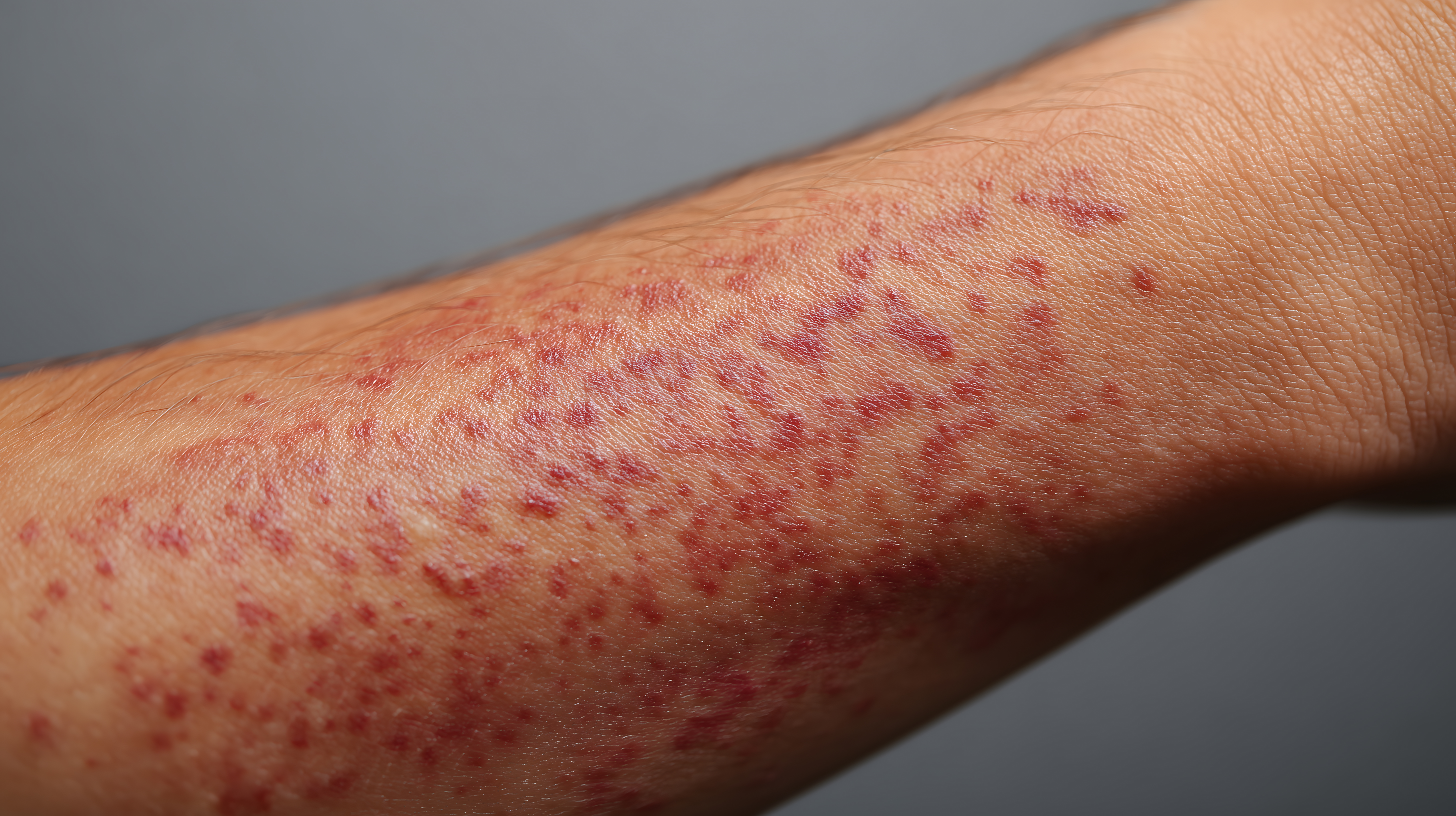 Das Bild zeigt eine nahaufgenommene Darstellung eines geröteten und entzündeten Unterarms. Die Haut erscheint gereizt und mit zahlreichen roten Flecken überzogen, was auf einen möglichen allergischen Ausschlag oder eine Hautirritation hindeutet. Die Perspektive der Aufnahme ist aus der Draufsicht, wodurch der Fokus direkt auf den betroffenen Bereich gelenkt wird. Die Farbpalette des Bildes ist überwiegend in Rottönen gehalten, die den Eindruck einer schmerzhaften Hautreaktion vermitteln.