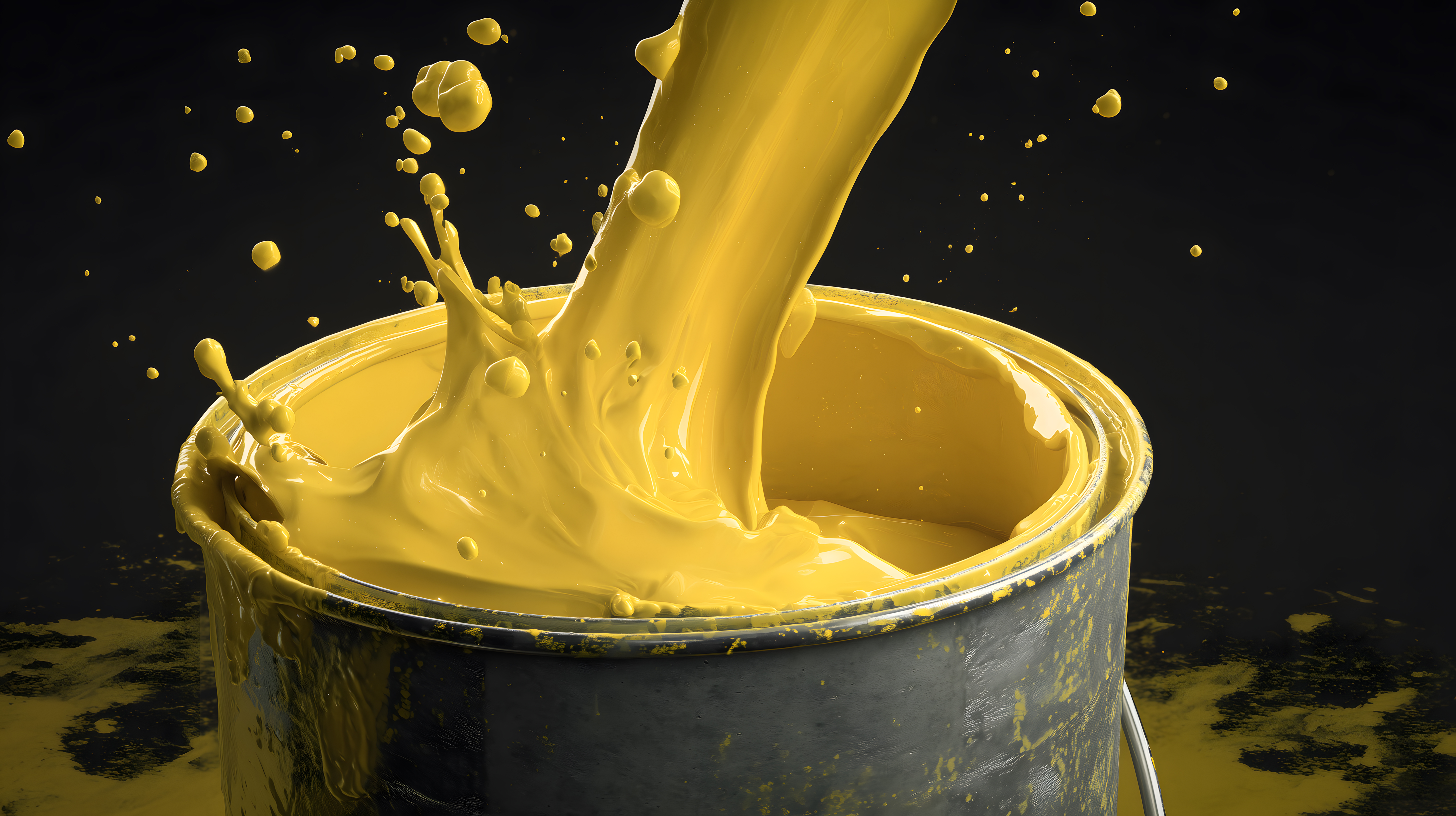 Gelbe Farbe spritzt in Metalleimer vor schwarzem Hintergrund von Marco Verch unter Creative Commons 4.0