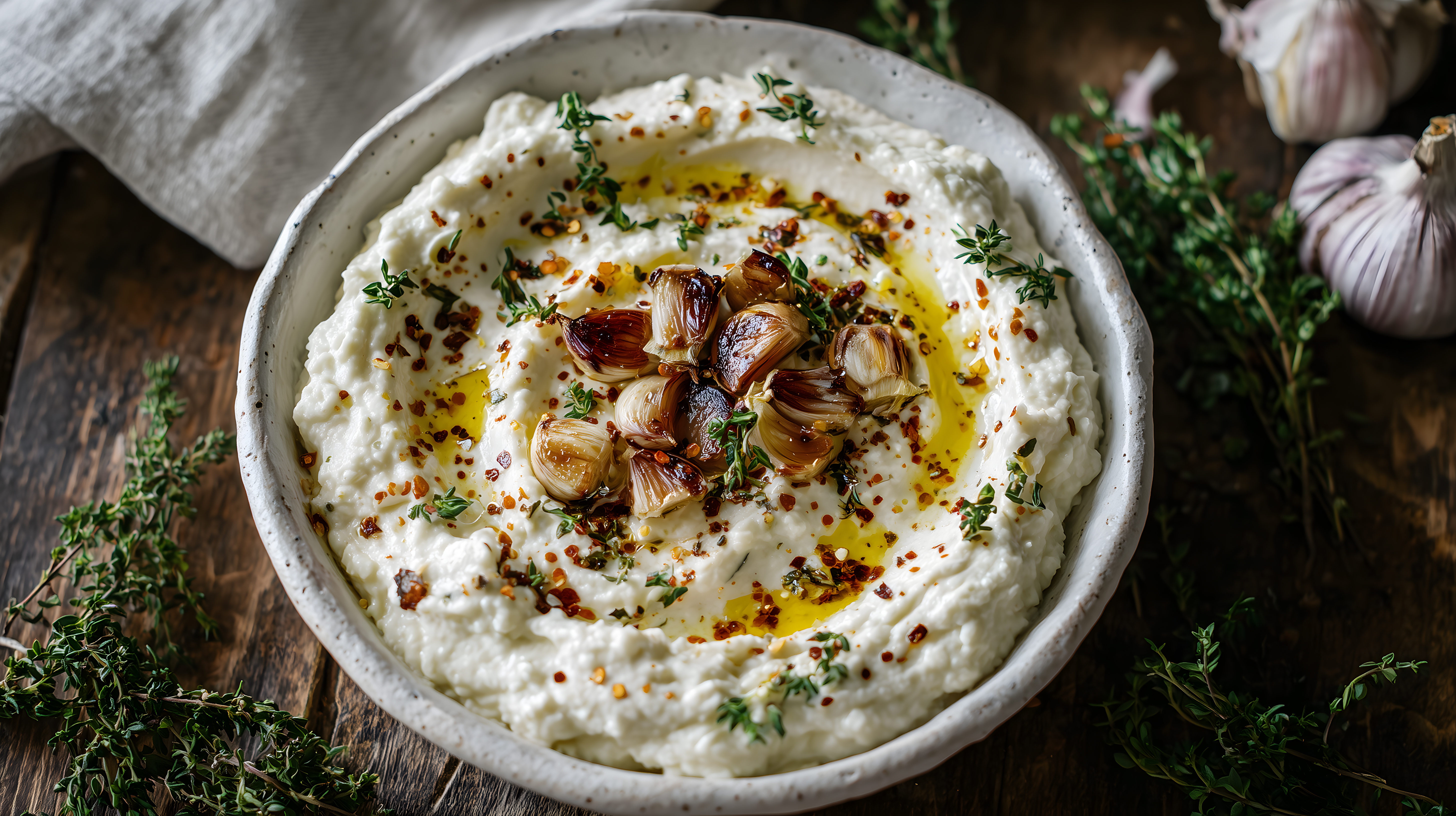 Das Foto zeigt eine großzügige Portion cremigen Hummus, der in einer rustikalen Schale serviert wird. Der Hummus ist mit gerösteten Knoblauchzehen und frischem Thymian garniert, was den kräftigen Geschmack des Gerichts unterstreicht. Die Nahaufnahme lässt den Betrachter die Textur und Konsistenz des Hummus deutlich erkennen, während die Schattierungen und Farbtöne eine warme und einladende Stimmung vermitteln.