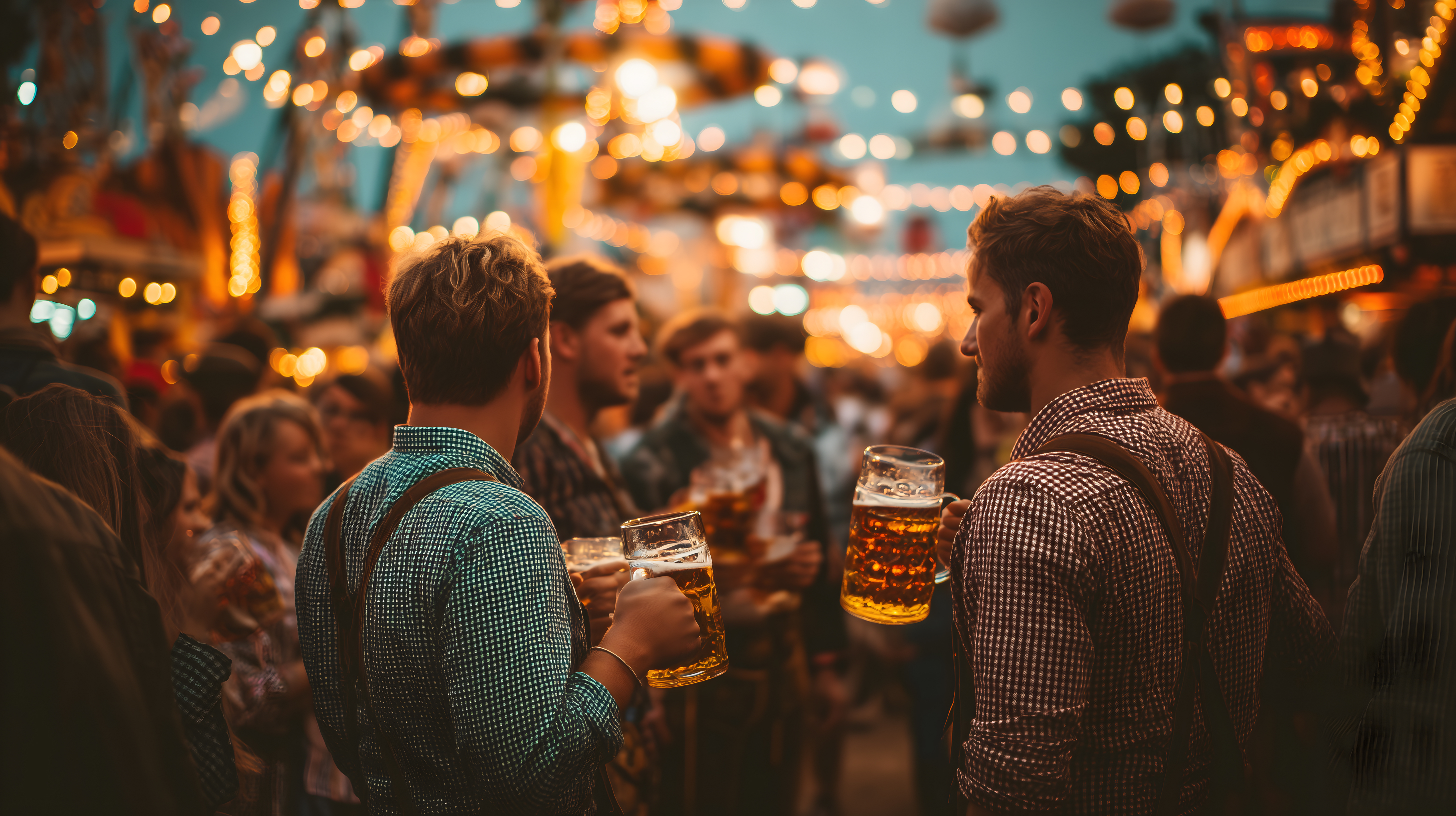 Das Foto zeigt eine Gruppe junger Erwachsener, die in einer stimmungsvollen, festlichen Umgebung zusammenkommen und Bier trinken. Die Szene spielt sich in einer belebten Straße mit bunten Lichterketten und Dekorationen ab, was eine fröhliche und lebendige Atmosphäre erzeugt. Die Nahaufnahme konzentriert sich auf die Gesichter und Getränke der Personen, was die Intimität und Interaktion zwischen ihnen betont.