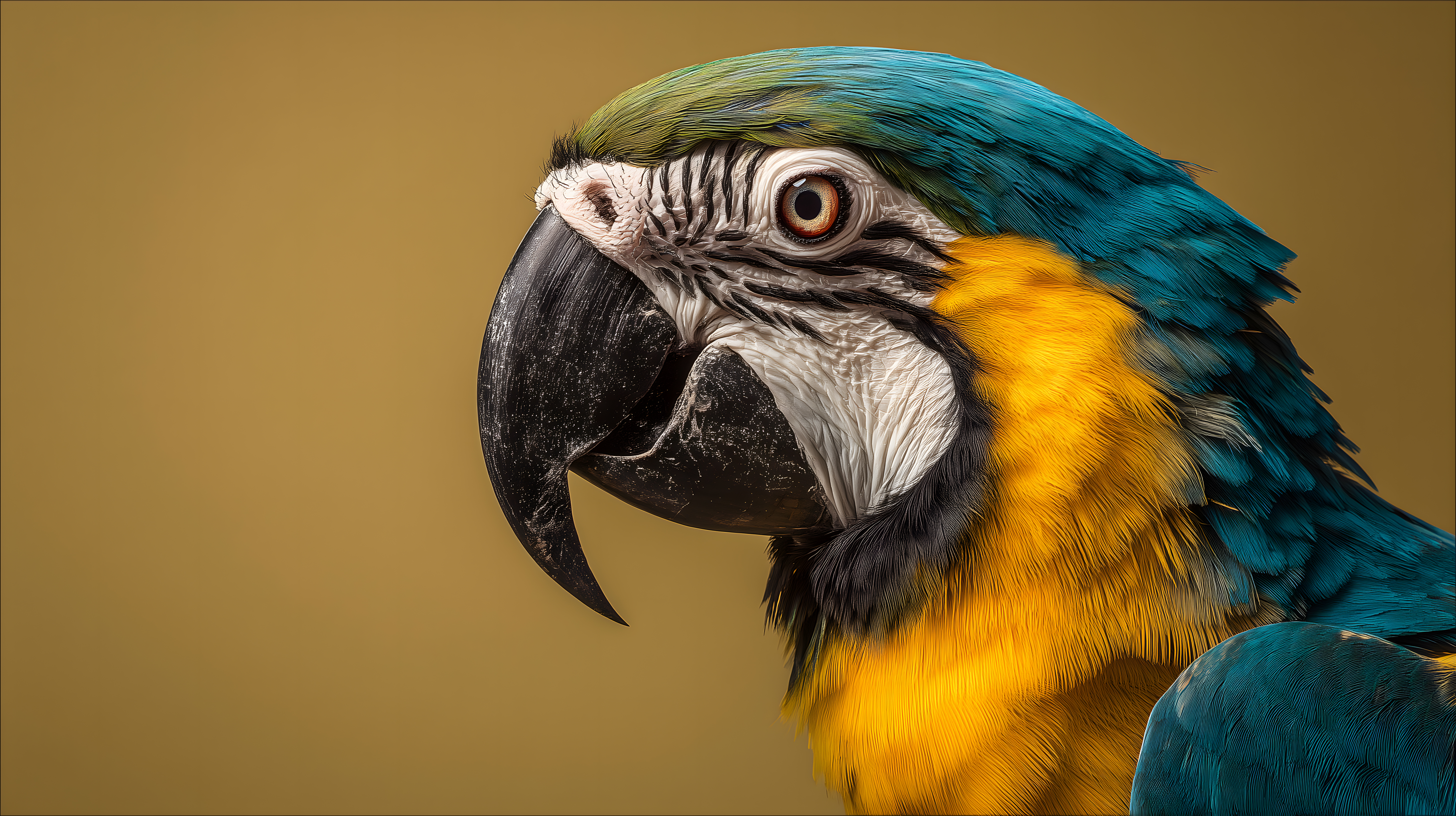 Das Bild zeigt eine detaillierte Nahaufnahme eines Ara-Papageien mit leuchtend blauem und gelbem Gefieder. Der Papagei ist vor einem braunen Hintergrund platziert, wodurch seine beeindruckenden Farben und Muster optimal zur Geltung kommen. Die scharfe Fokussierung auf den Kopf des Vogels legt den Schwerpunkt auf seine ausdrucksstarken Augen und den markanten Schnabel.