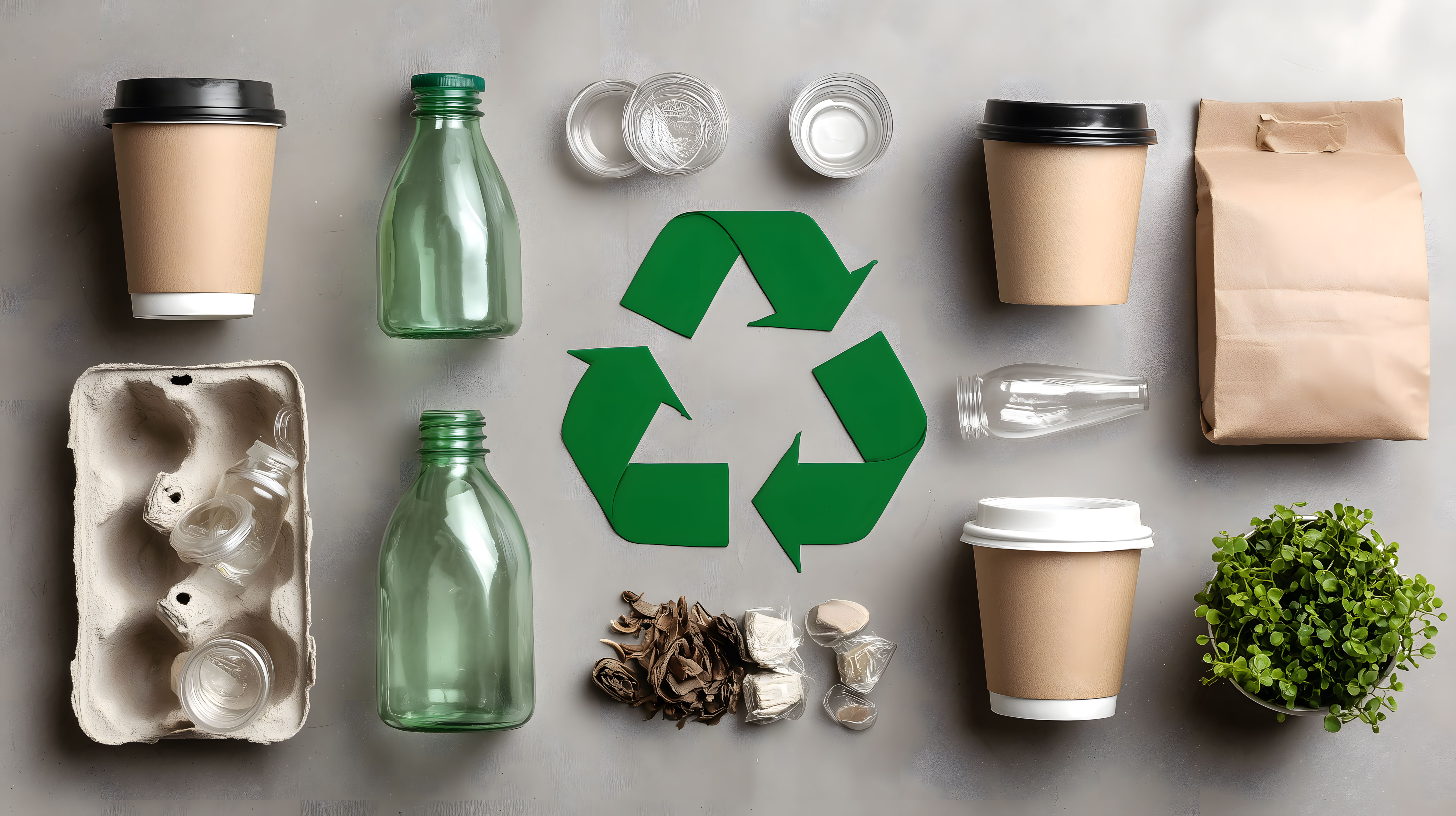 Das Bild zeigt eine Draufsicht auf verschiedene Recycling-Materialien und -Symbole auf einem grauen Hintergrund. Im Vordergrund sind zwei Pappbecher und zwei Papiertüten zu sehen, während im Hintergrund Glasflaschen, Metalldosen, ein grünes Recycling-Symbol und Grünpflanzen angeordnet sind. Die Farbpalette ist überwiegend Grautöne, Grün und Braun, was einen modernen, minimalistischen Stil erzeugt.