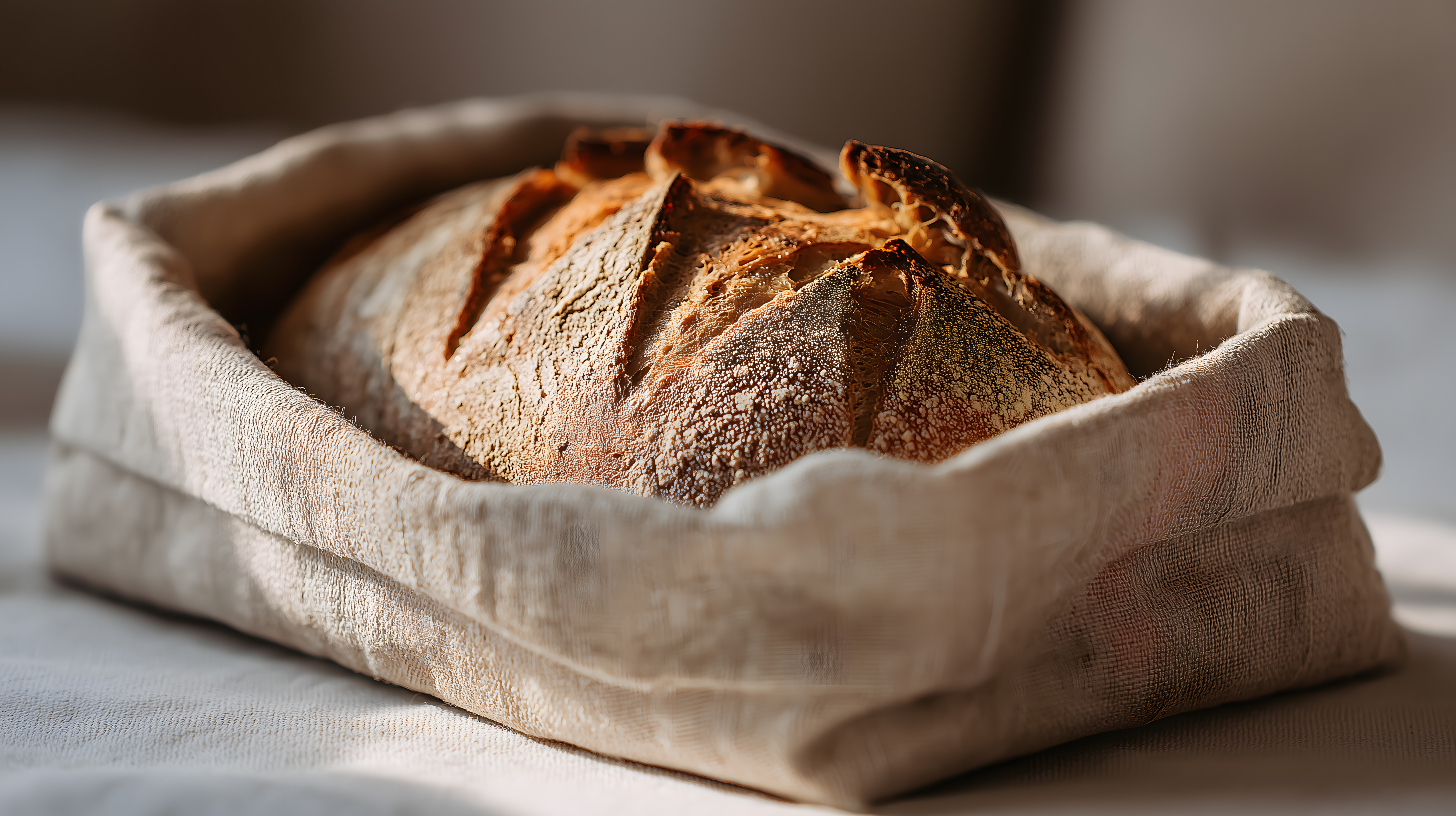 Das Bild zeigt ein frisch gebackenes, rundes Brot, das in einem hellbraunen Stofftuch drapiert ist. Die Kruste des Brotes weist eine dunkelbraune, leicht krustige Oberfläche auf, die einen appetitlichen Eindruck vermittelt. Die Perspektive der Aufnahme ist eine Draufsicht, die das Brot in seiner ganzen Pracht präsentiert. Die Farbpalette des Bildes ist warm und erdig, mit Nuancen von Braun und Beige, die eine gemütliche und heimelige Atmosphäre schaffen.