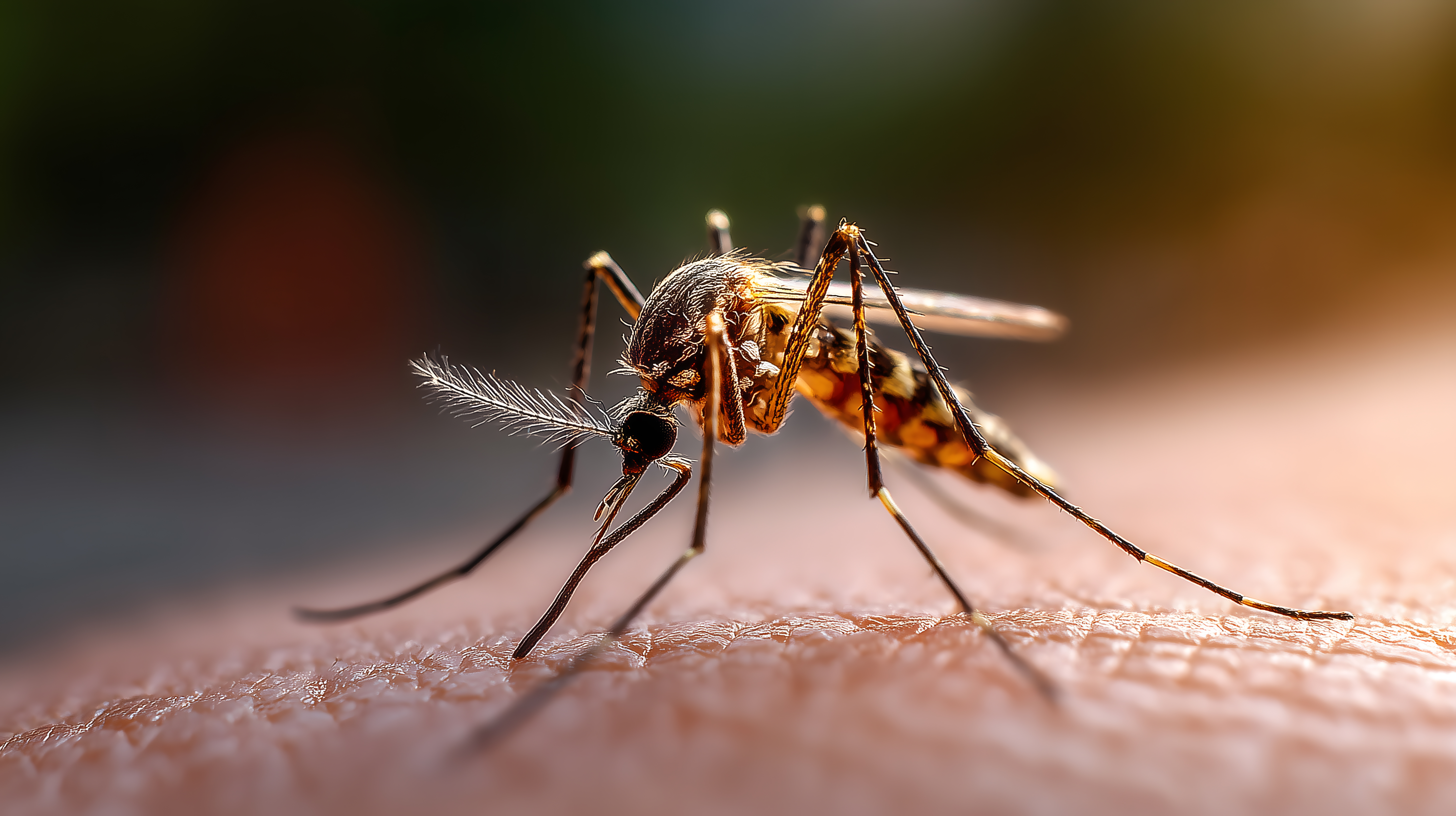 Das Foto zeigt eine detailreiche Nahaufnahme einer Mücke, die auf einer feuchtschimmernden Oberfläche sitzt. Der Körper des Insekts ist in warmen, goldenen Tönen gehalten, die durch den Einfallswinkel des Lichts betont werden. Die scharfe Fokussierung auf den Kopf und die Fühler der Mücke lässt ihre Strukturen und Merkmale klar erkennbar hervortreten.